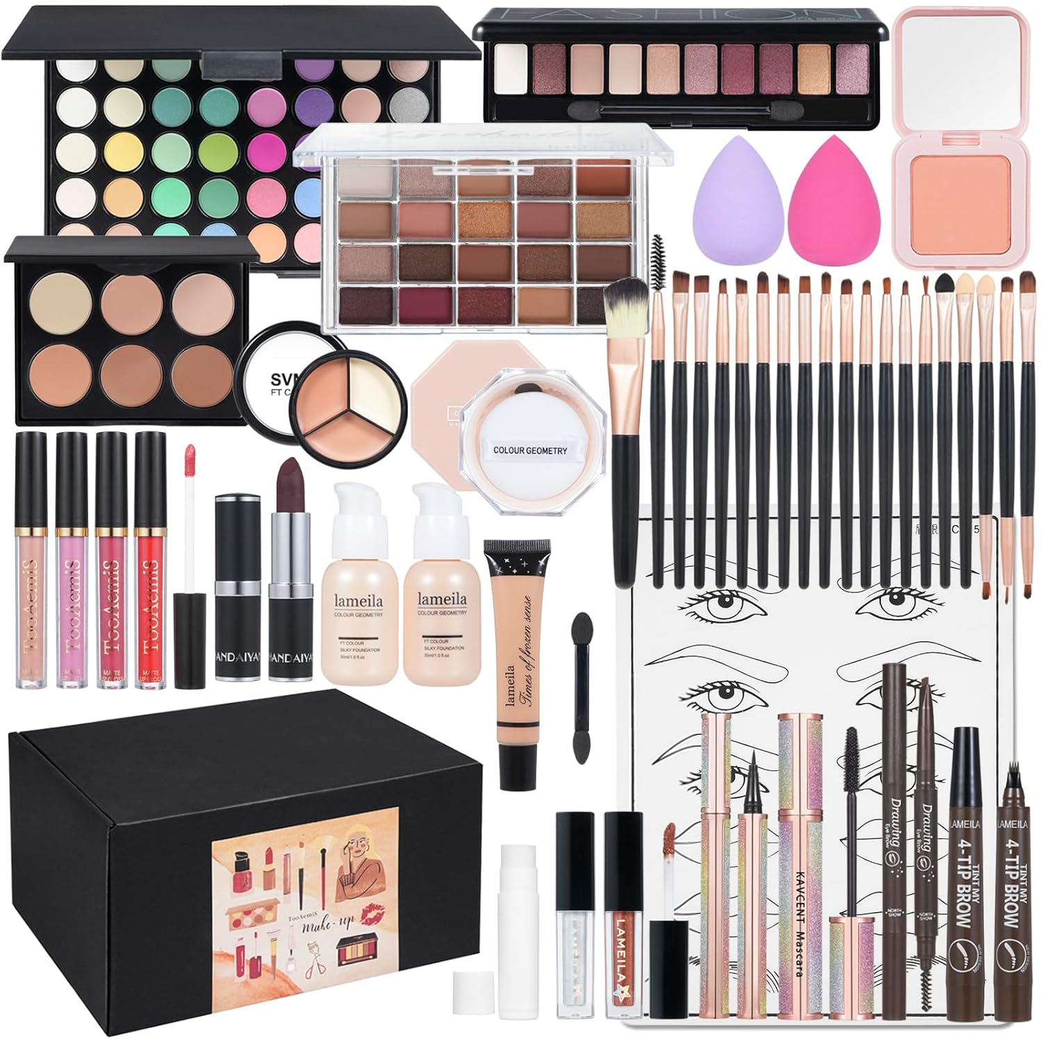 All in One Makeup Kit Makeup Kit for Women Full Kit Multipurpose Makeup ,eyeshadow、 liquid foundation,Loose powder,Eyebrow pencil,4-color lip gloss set