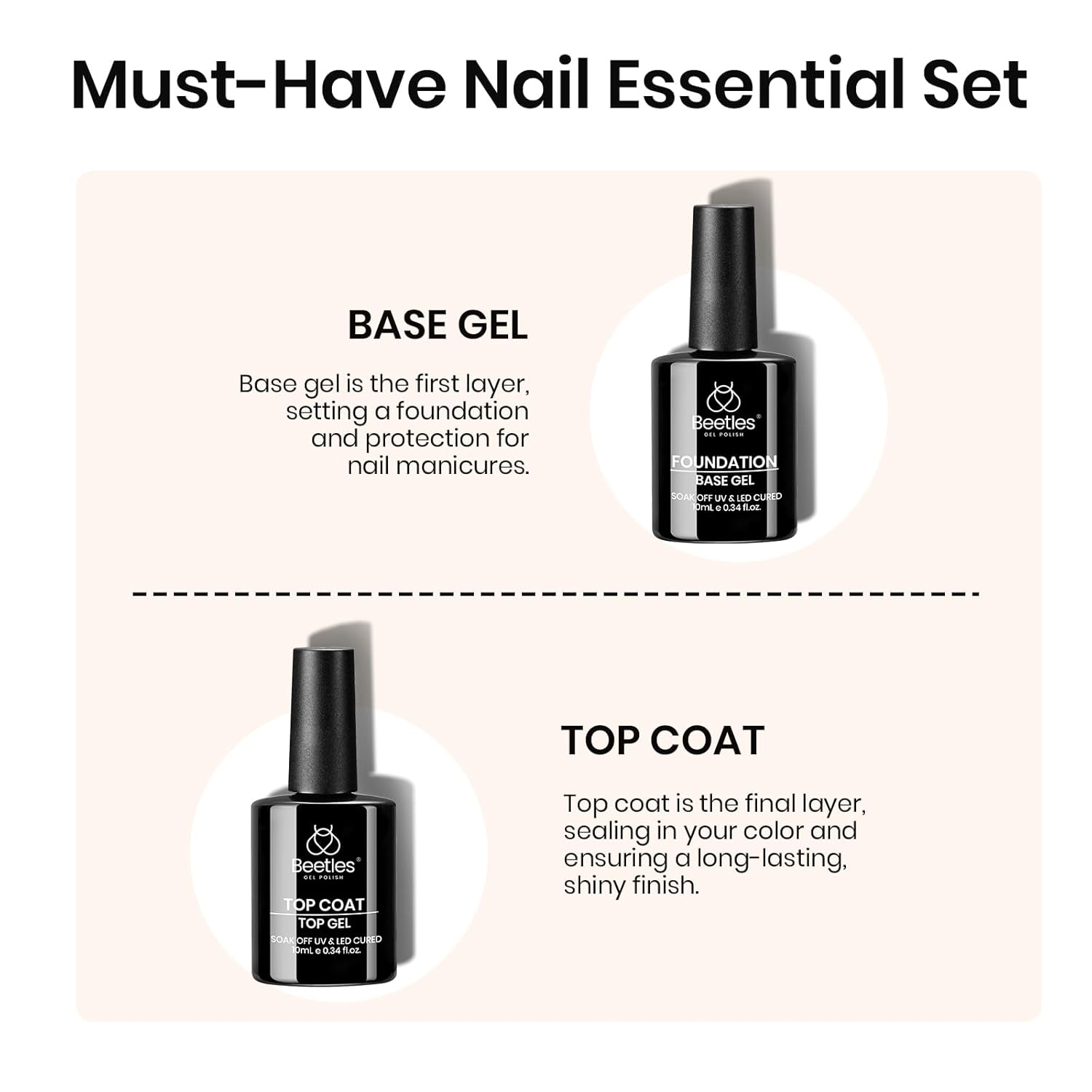 Beetles Gel Base and Top Coat Set, 2pcs 10ml Shine Finish and Long Lasting Top Coat Gel Nail Polish, Soak Off LED Nail Lamp Nail Polish Art Design Home DIY Manicure Gifts for Women