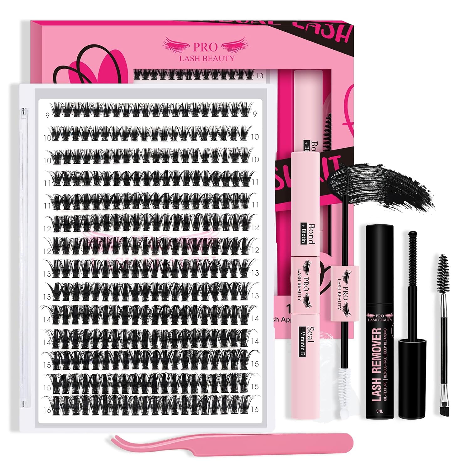 Lash Clusters Kit 280pcs Eyelash Clusters D Curl Eyelash Extension Kit Individual Lashes with Lash Bond and Seal Lash Remover Lash Applicator Easy to Apply at Home(50D-9-16mix Kit)