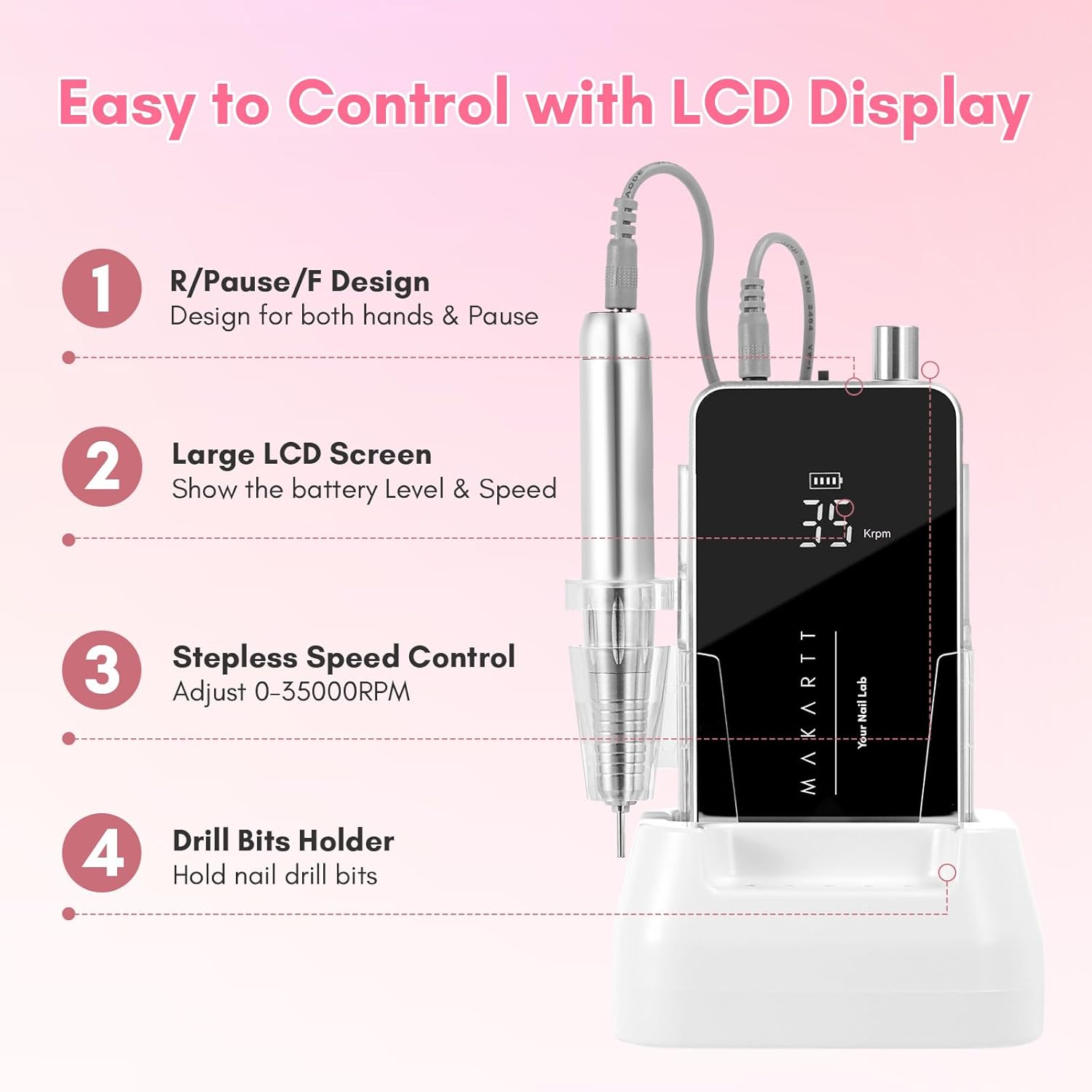 - 2-in-1 Desktop & Portable Design: The Makartt electric nail drill features a detachable body and smart charging base for stable desktop use or portability. Durable housing and built-in overload protection ensure long-term reliability. Certified by UL, FCC, CE, and RoHS.