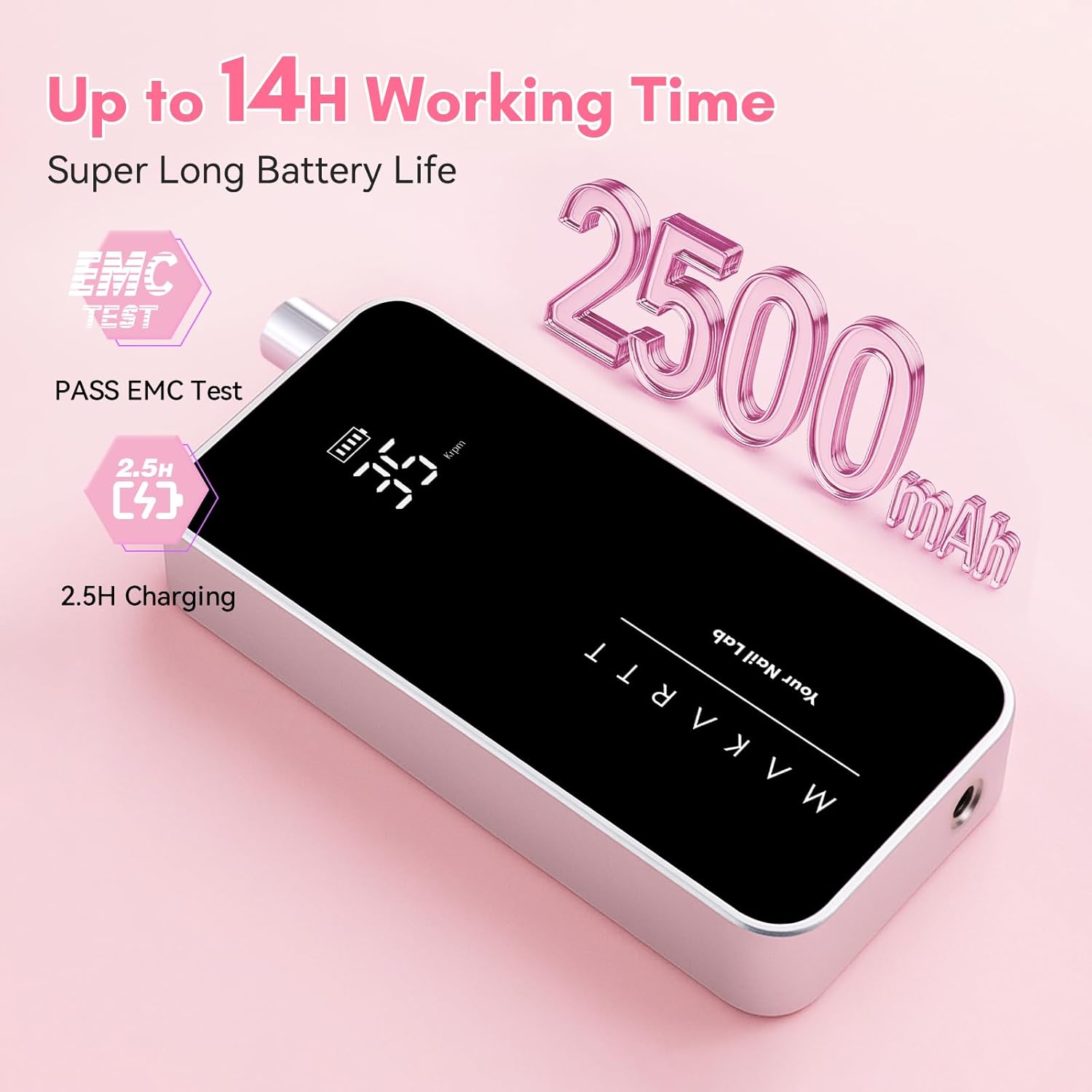 - 2500mAh Rechargeable Battery: Brushless nail drill delivers up to 14 hours of use on a full 2.5-hour charge. The nail filer electric is ideal for salons, travel, home or busy schedules. (Use original adapter for optimal performance.)