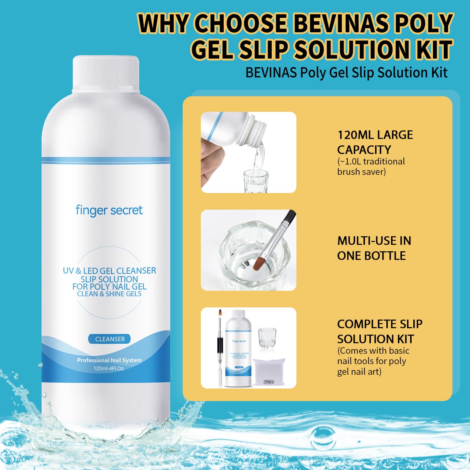 - 【BEVINAS 4Fl.Oz SLIP SOLUTION UTILITY KIT】BEVINAS slip solution kit included a 4Fl.Oz slip solution for poly nail gel,a brush spatula, a glass cup, 100 nail cleaning pads. The slip solution evenly coats the poly gel, making it easier to mold and longer lasting.Suitable for home DIY salon beginners.