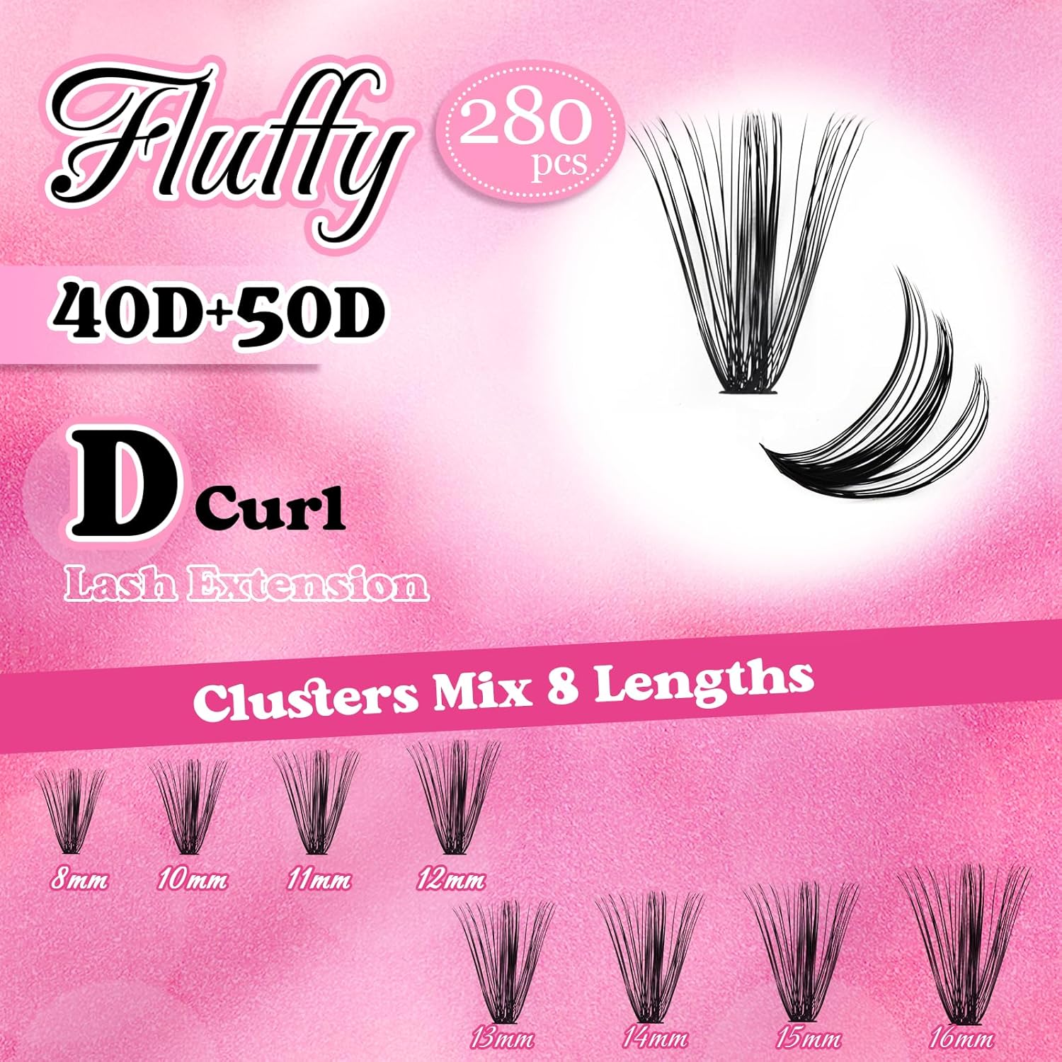 Cluster Lashes D Curl Lash Clusters 280 Pcs Lash Extension Clusters Individual Lashes Soft DIY Eyelash Extensions Mixed Tray Eyelash Clusters Natural Look (40D+50D-0.07D, 8-16mm)