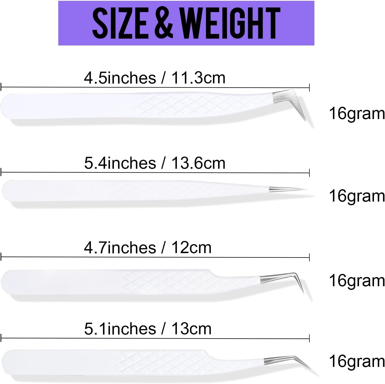 Fiber Tip Lash Tweezers For Eyelash Extension 4 Pcs Tweezers Professional Artist Tech Work Kit Tools,Best Volume Eyelash Extensions Precision 90 45 Degree(White Silver)