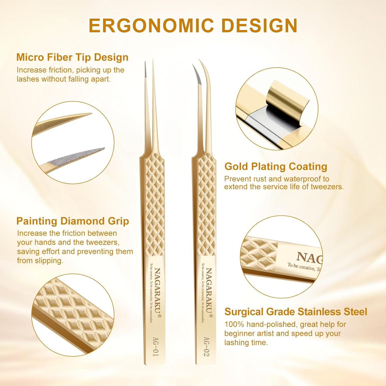 NAGARAKU 1 Pair Precision Fiber Tip Tweezer for Eyelash Extensions Professional Eyelash Tweezers Antistatic Straight & Curved Tip Tweezers with Box(Isolation & Volume Lash Tweezers AG-01 & AG-02)