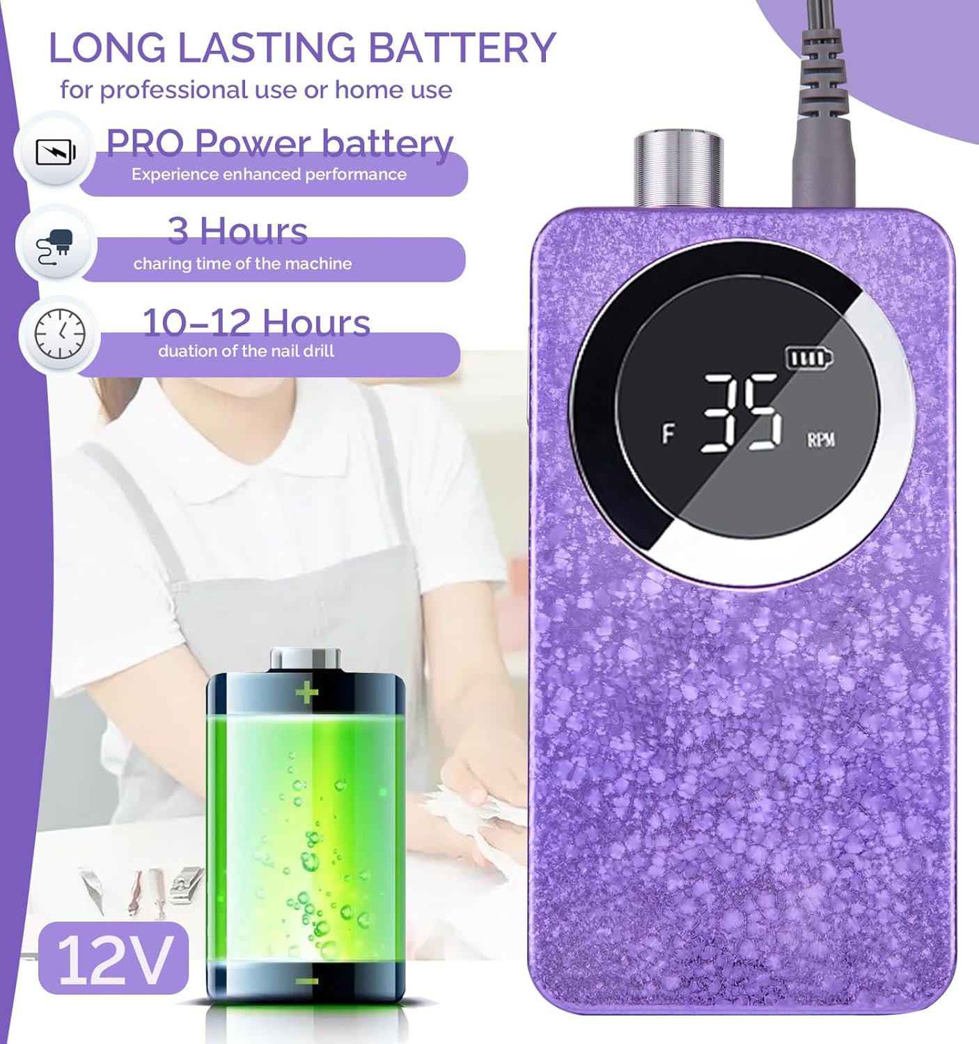Professional Cordless Electric Nail Drill Kit – 35000 RPM Rechargeable E File with 10+ Hour Battery, 6-in-1 Bits – Portable Acrylic Gel Remover for Salon/Home,Drills para Uñas Professional