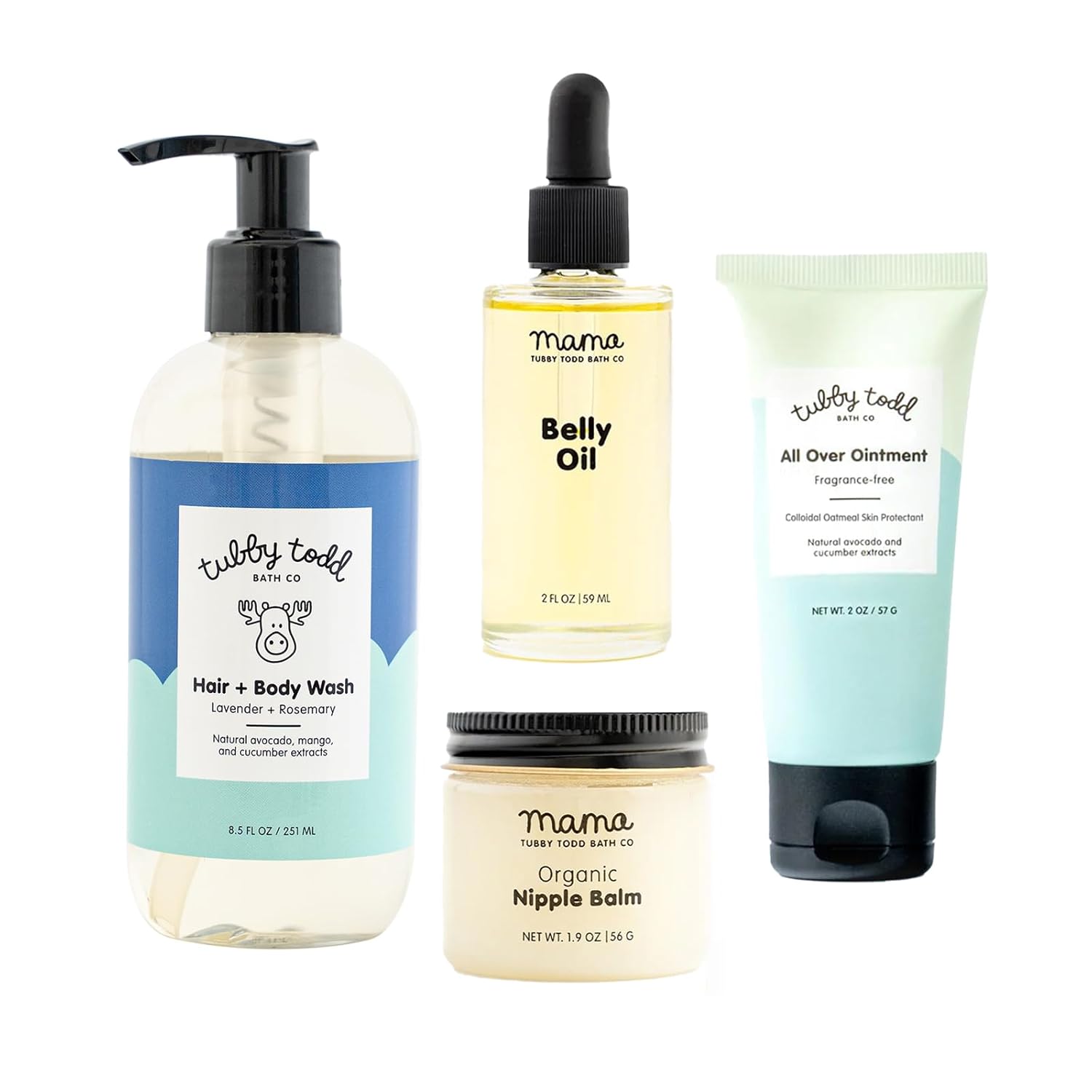Tubby Todd New Baby & Mom Sensitive Skincare Kit - The Mama + Baby Gift Set - Baby Shampoo and Body Wash, All Over Ointment, Belly Oil & Nipple Balm - Standard Size Lavender Rosemary