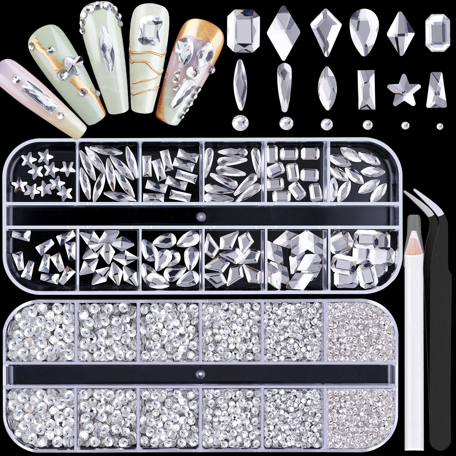 - 💎PACKAGE CONTENT -- The package contains 120Pcs multi shapes flatback gems crystal and 3100Pcs 1.5-4mm round beads, totally 3220Pcs Clear rhinestones. Additionally, 1 tweezers for large size gems and 1 pickup pen for small size gems. This rhinestones kit makes it easy for you to make any nail art you like, and will bedazzle your acrylic nails!