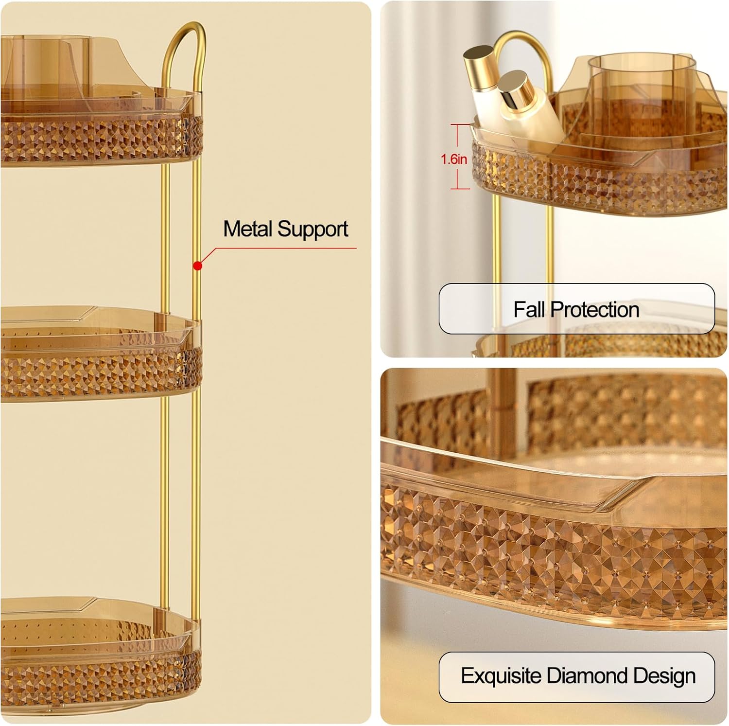 - Premium Quality Materials: The cosmetics organizer is composed of high-quality acrylic trays and sturdy metal brackets, which are stable enough. The edge details of the tray have been raised to prevent items from falling off during rotation