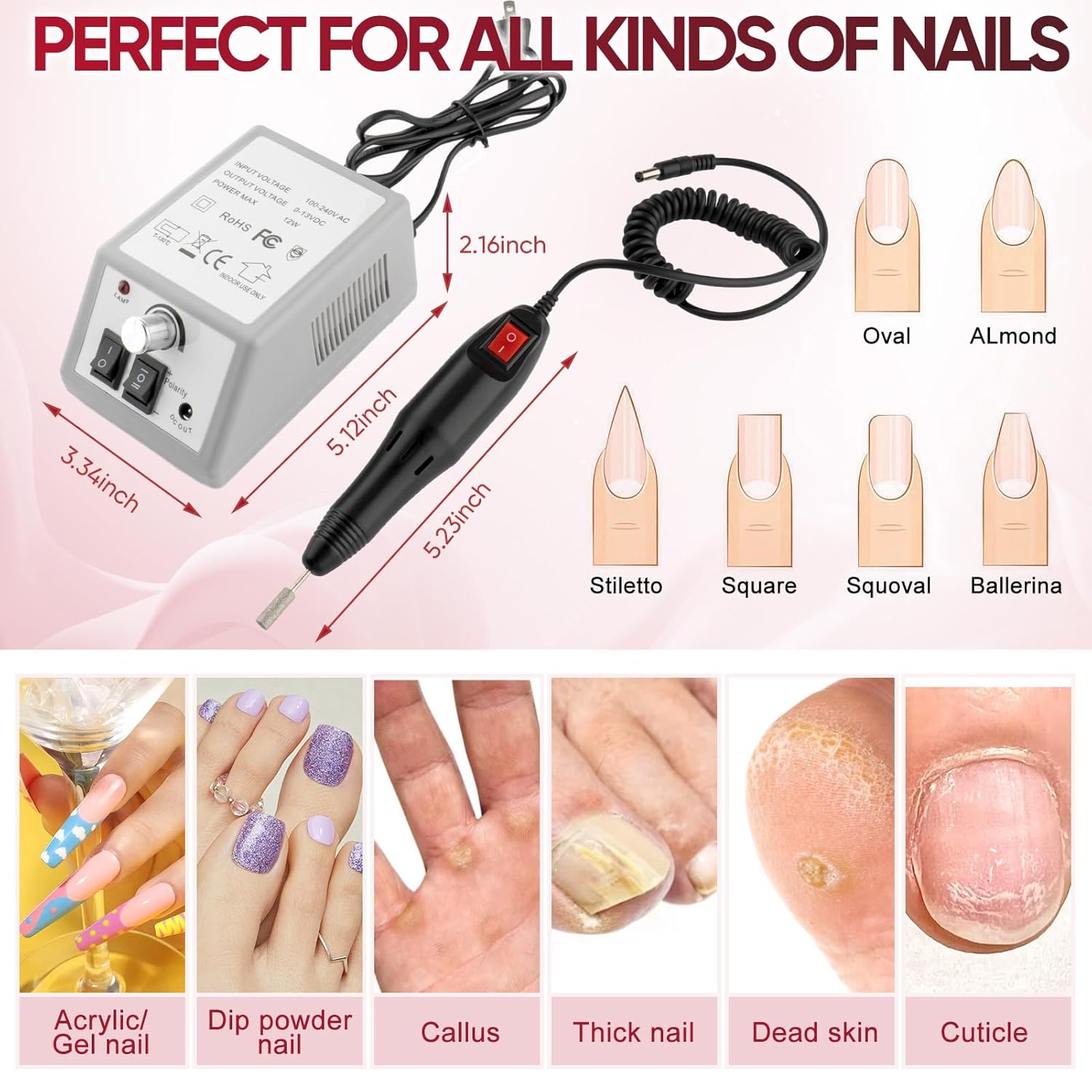 Professional Electric Nail Drill Machine Nails File Manicure Pedicure Set for Acrylic Gel Dip Powder Art Shape Remover Tool Polisher Grinder Low Noise with 6 Drill Bits 156pcs Sanding Bands
