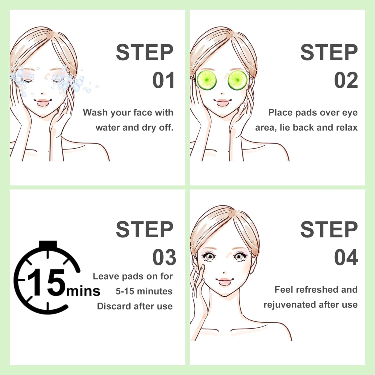 - Hassle Free Hydration Boost: hydrate your skin in the easy way with our soothing eye pads; Start with a clean face, no makeup, place the soothing cucumber eye patches in each eye area, then lie down and relax for 5-15 minutes, enjoying nourishment to revitalize your under eye area; It's an ideal solution for tired and dry skin, without mess; For an extra refreshing experience, store the soothing eye pads in the refrigerator