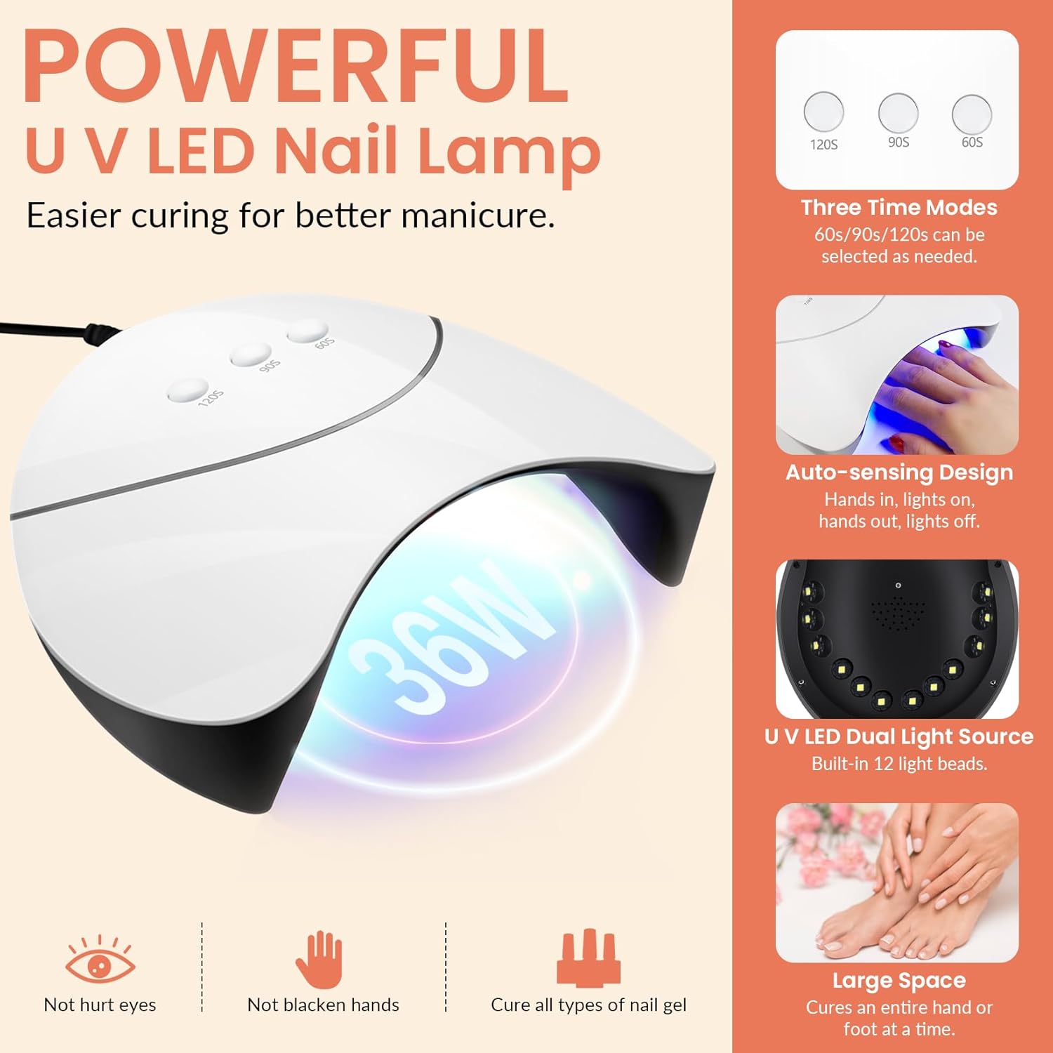 - ăProfessional U V/LED Nail Lampă Professional nail light in this gel nail polish kit has three time options: 60s/90s/120s, and automatic sensor design, allowing you to easily control the curing of gel nail polish. U V/LED dual light source design, with 12 lamp beads, can efficiently cure almost all kinds of nail gels, not hurt your eyes, not black hands. Enough space to cure a whole hand or foot, bring you high quality nail art curing experience.