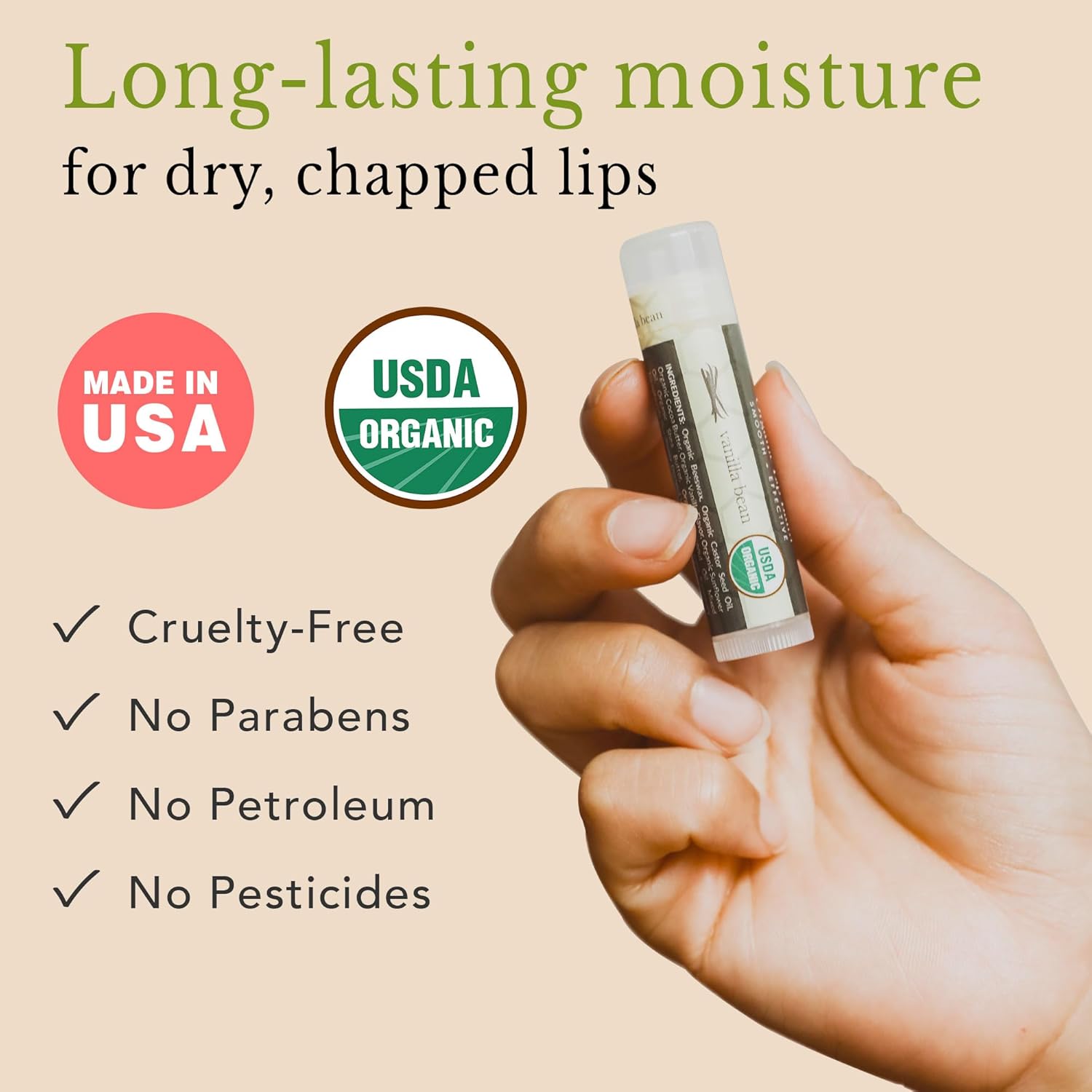 - MADE IN USA FROM CLEAN AND ORGANIC INGREDIENTS: Proudly made in the USA, our organic lip balm is formulated from 𝐜𝐥𝐞𝐚𝐧 𝐚𝐧𝐝 𝐧𝐚𝐭𝐮𝐫𝐚𝐥 𝐢𝐧𝐠𝐫𝐞𝐝𝐢𝐞𝐧𝐭𝐬, ensuring quality and purity in every chapstick organic. No parabens, petroleum, phthalates, synthetic fragrances, or other toxins. Our natural chapstick offers only the purest and most natural ingredients, perfect for those seeking vanilla chapstick solutions.