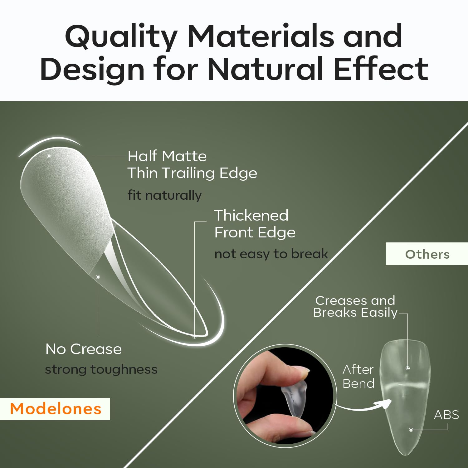- Upgraded Half Matte Long Stiletto Nail Tips: You can easily extend your nails and enjoy the fun of DIY manicure with Modelones pre-buff gel nail tips! Half-matte texture design for increased friction and increases adhesion