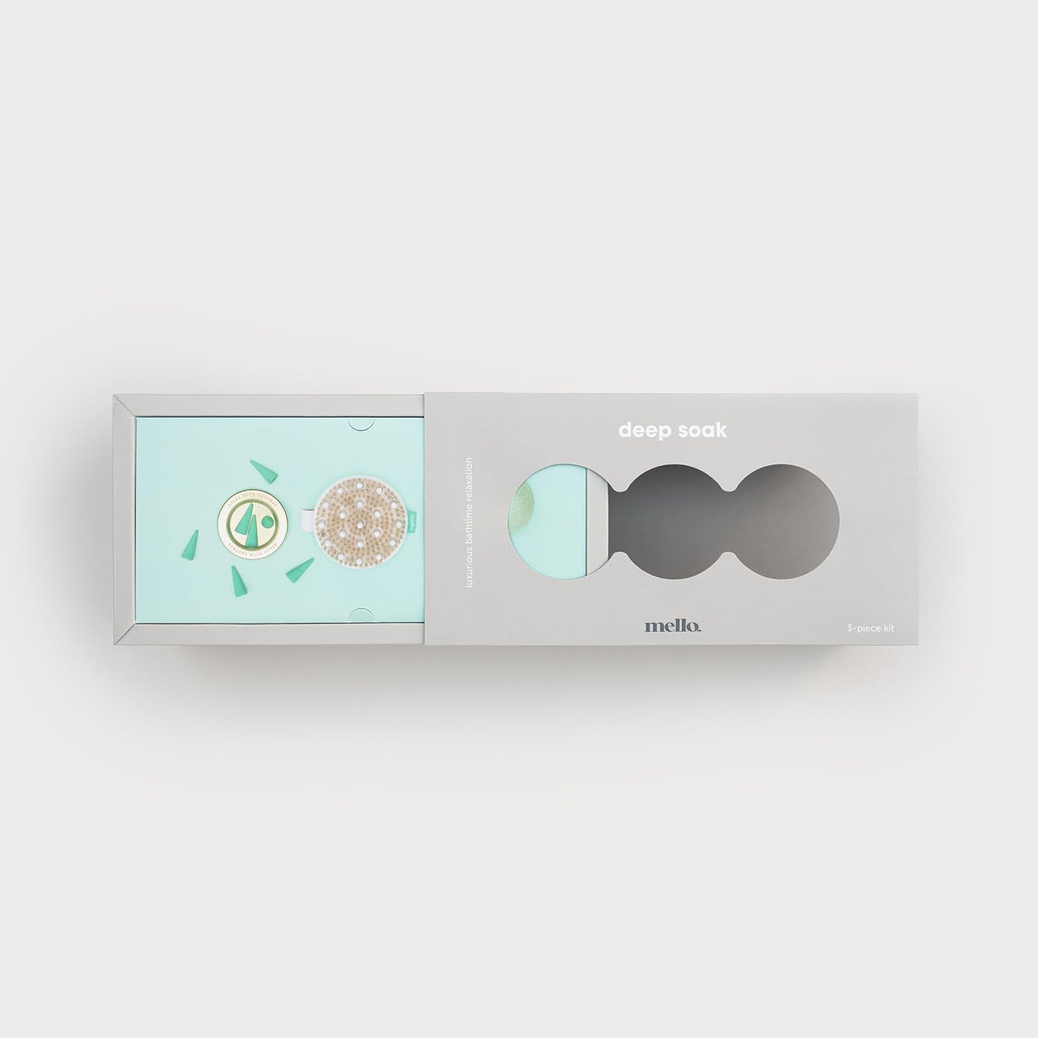 - New from Mello comes Deep Soak; Transform your bath time into a luxurious experience; Includes a massaging bath brush, incense cones & 2 konjac sponge; Presented perfectly for thoughtful gifts for her