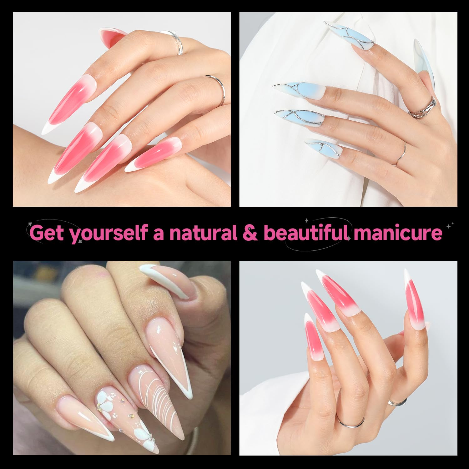 - ❤️【Natural Fit Effect】 The extra long stiletto gel nail tips feature “ Thin back edge, thick front edge”. The thinner back edge can make the full cover nail tips fit your nails better. Our tips have smooth edges with a gentler curve, making them fit comfortably against the nail bed without feeling tight. They maintain color well, don’t separate or peel, and make the nails look more natural.