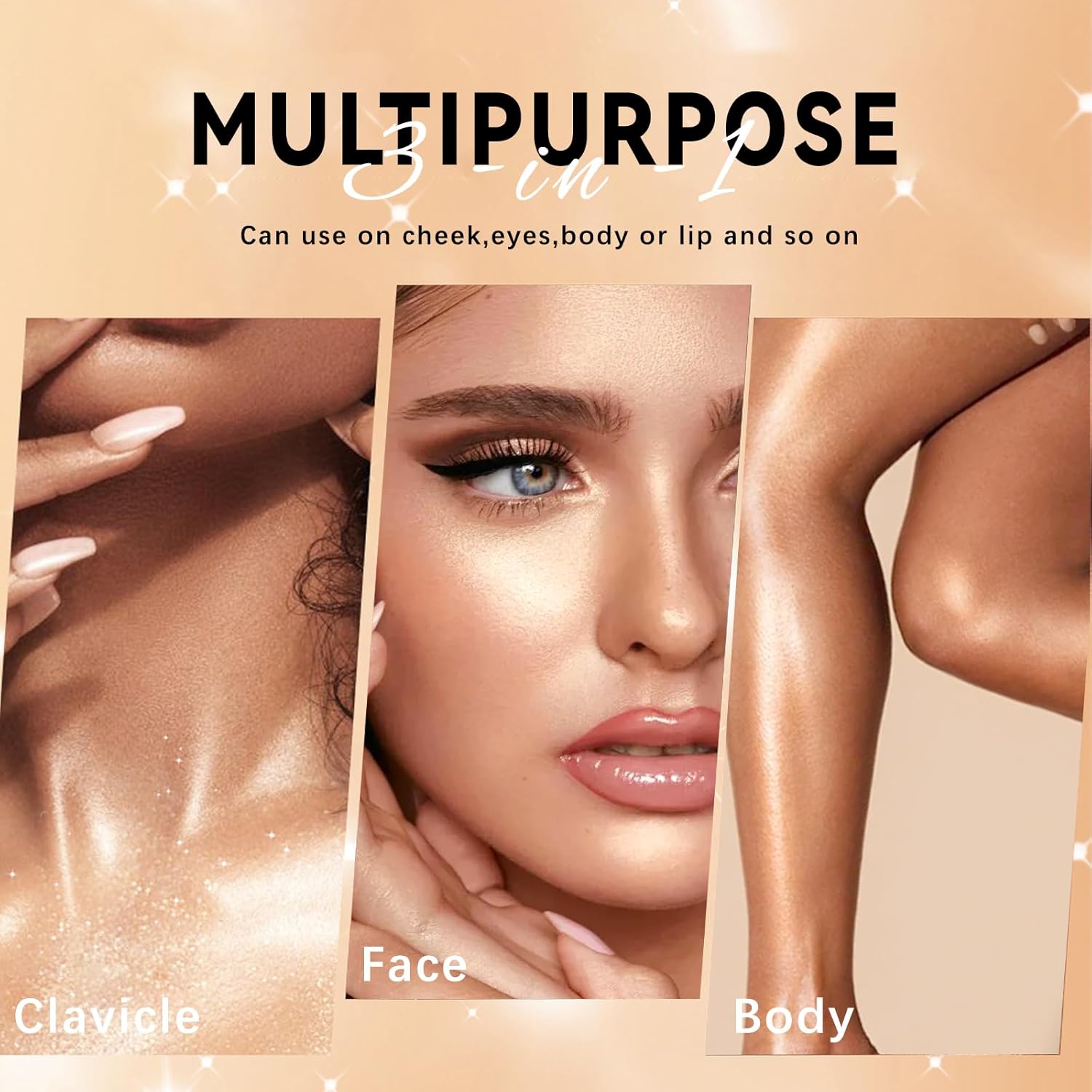 - 【Multiple Usages】Not only can this body highlighter be used on face makeup like shimmering eyeshadow and cheek blush, but it can also be used as a body shimmer on the neck, collarbone, legs and anywhere you want to shine.