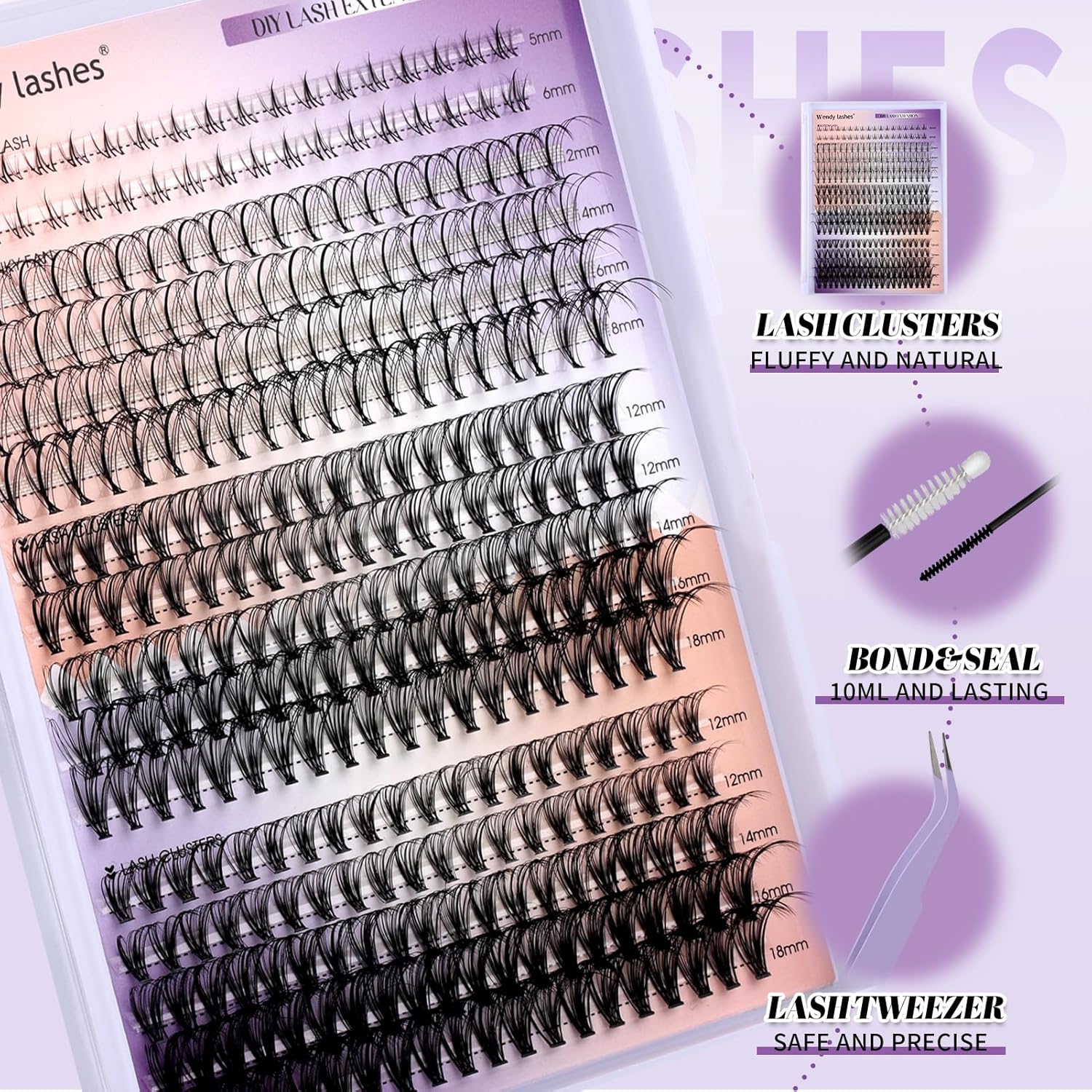 - DIFFERENT STYLES OF COMBO TRAYS: Our lash cluster kits come with four different styles of lashes, whether you want natural or thick, fox eyes or doll eyes, with a mix of lengths ranging from 12-18mm to meet any of your needs.