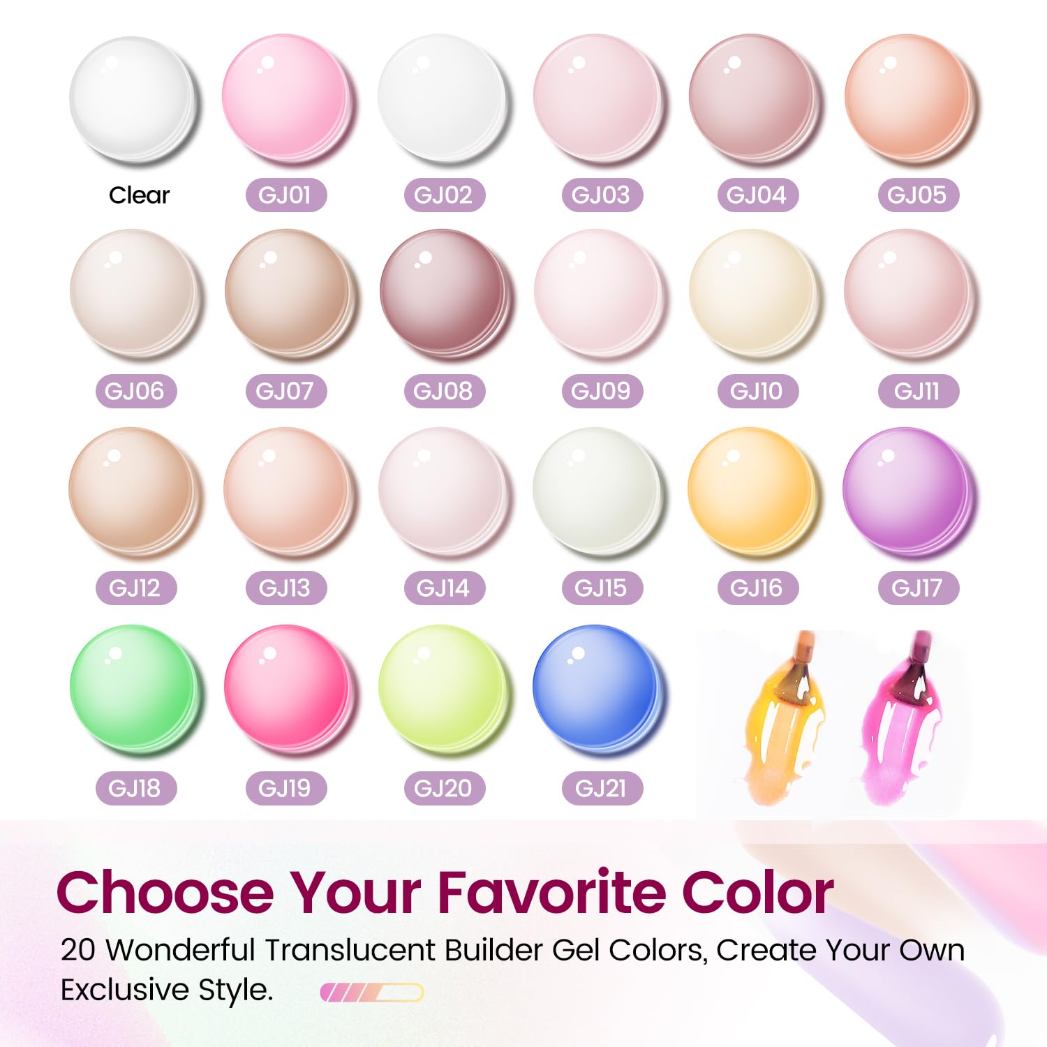 - What You Get: 21 bottles of colorful builder gel with a capacity of 5 ml, 1 bottle of 15 ml of clear building gels), 1 bottle of base and top coat (with a capacity of 5 ml), 1 nail lamp, 1 cuticle oil pen,100 pieces of extension stickers and manicure tools.