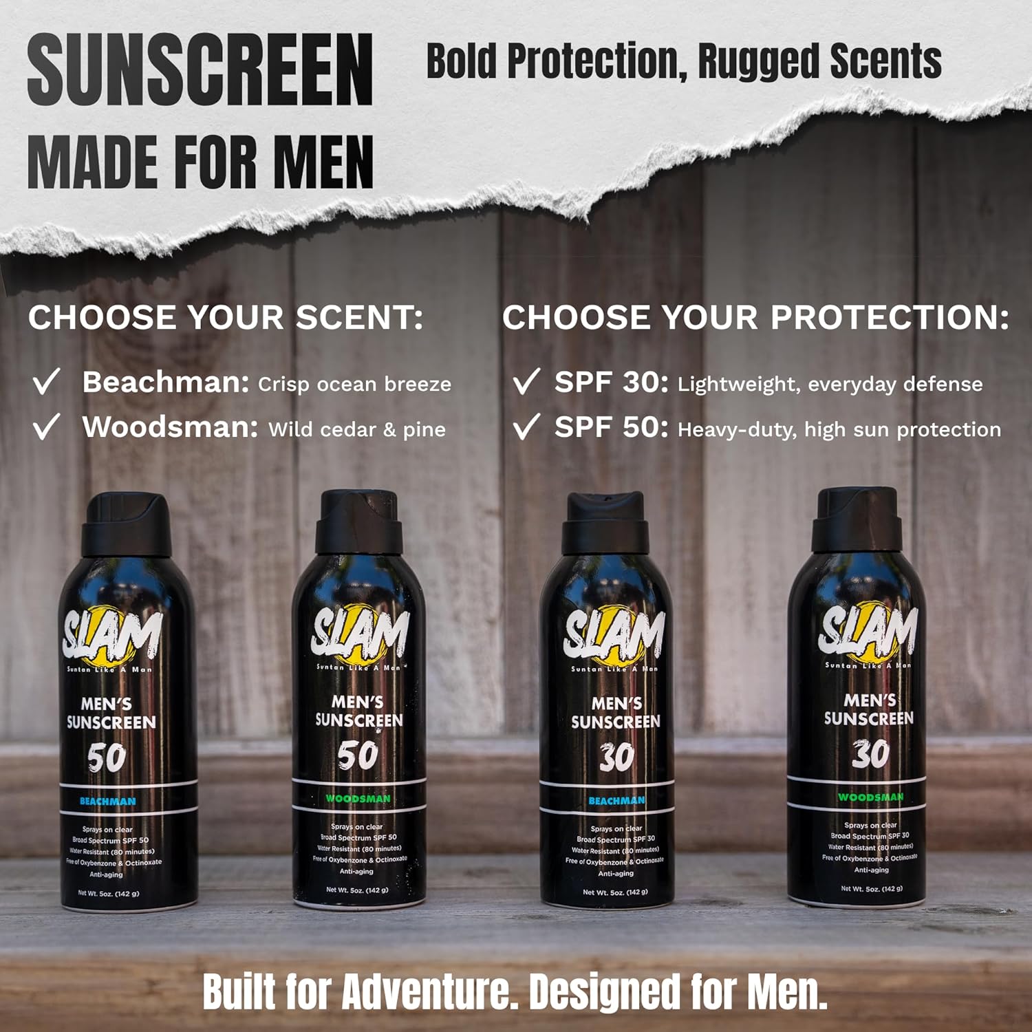 - Manly Cedarwood Scented Sunscreen Spray: Embrace the rugged aroma of cedarwood with this men’s sunscreen spray. Slam Lotion BeachMan SPF 30 sun screen spray keeps you protected and smelling great on every outdoor adventure. The perfect size sunscreen spray.