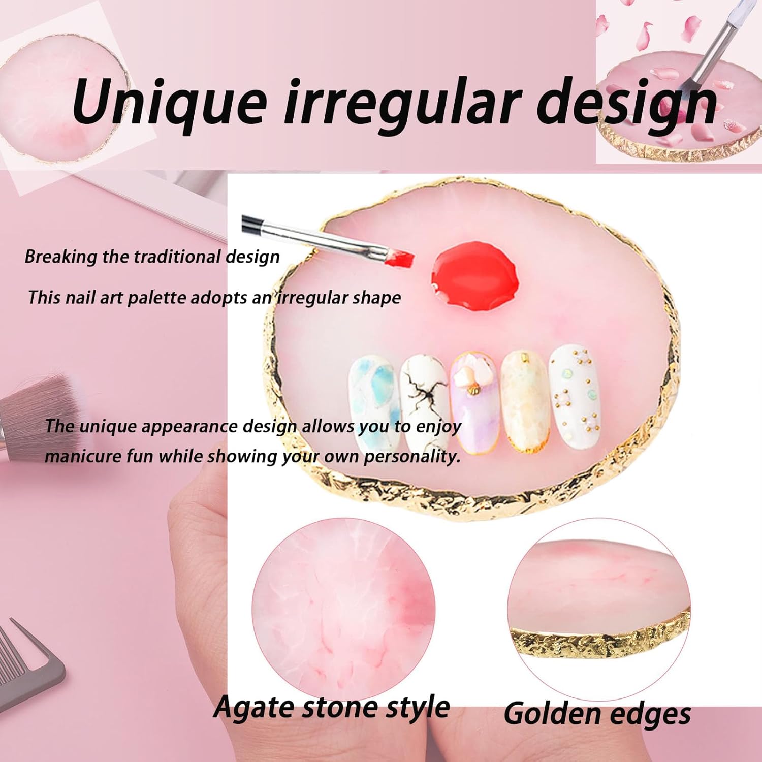 - 💅【Environmentally friendly and durable resin material】These nail art palettes are made of high-quality resin material, which is not only environmentally friendly and safe, but also sturdy and durable. It’s also extremely easy to clean, with a simple wipe to restore cleanliness. The edges are sealed with smooth gold edges to effectively prevent scratches, making your use more comfortable and keeping your hands safe.