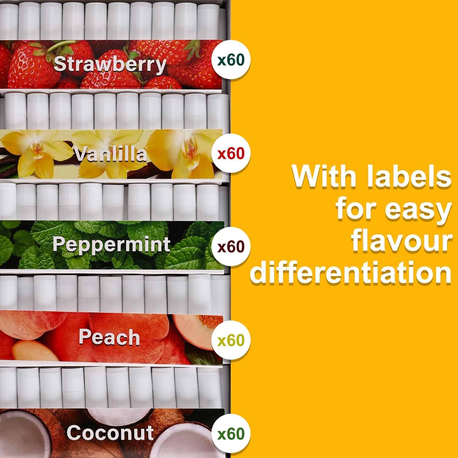 - ✅ 【5 Flavors Lip Balm】Our lip balm bulk contains 300 pack in 5 flavors -Peach, Mint, Strawberry, Coconut, and Vanilla. Labels are built into the box to help distinguish flavors