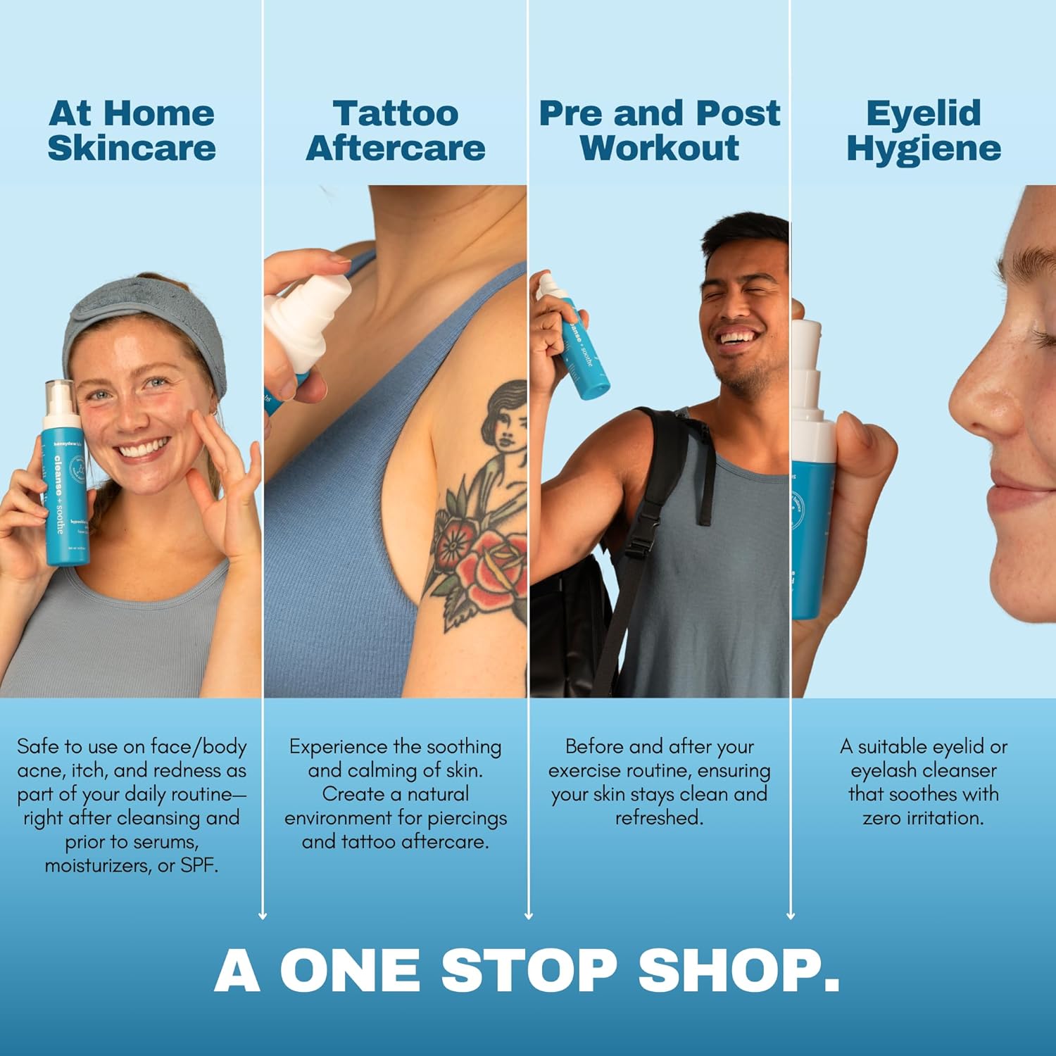 - Product Benefits : Cleanses and soothes skin redness, acne-prone skin, eyelids, eczema and more. Safe for all ages. Hypoallergenic. Cleanses and soothes skin redness, acne-prone skin, eyelids, eczema and more. Safe for all ages. Hypoallergenic.