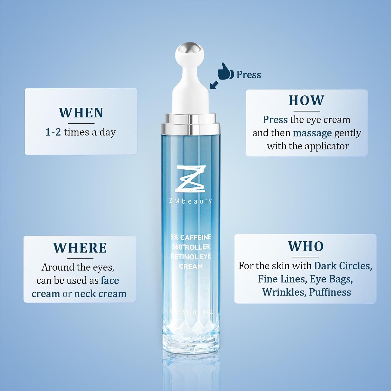 - Eye Care with Reliable Formula: ZMbeauty eye cream has been tested by multiple subjects in the USA, including OPHTHALMOLOGISTs and DERMATOLOGISTs, and all reported no irritation after test. Suitable for sensitive, dry, or oily skin, a perfect gift for your wife, mom, daughter, friends and families.
