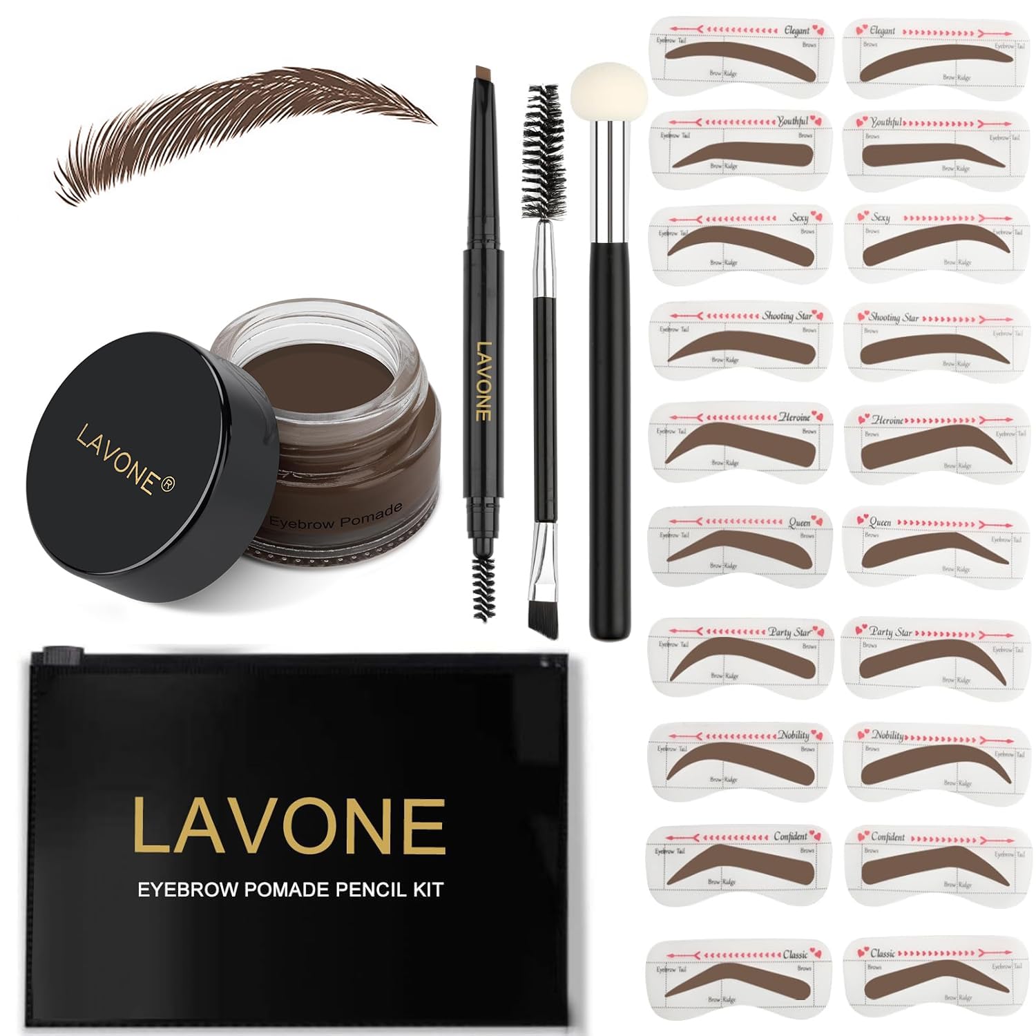 - [Whatβs in the eyebrow kit]: LAVONE makeup eyebrow kit includes eyebrow powder(Dark Brunette), brow pencil (dark brown), 20 eyebrow stencils (10 different shapes), a sponge applicator, a dual precision brush and a zipper pouch for on the go.