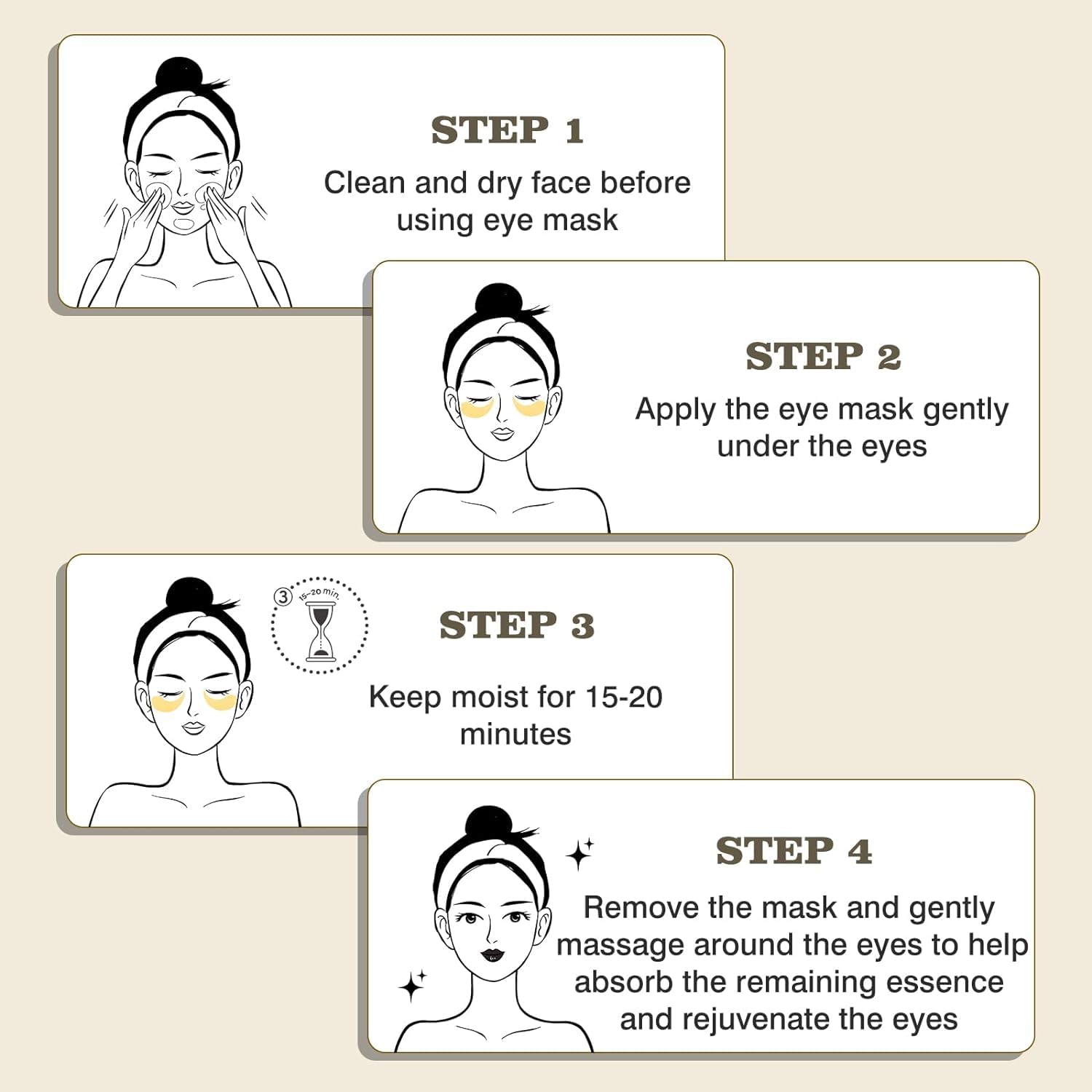 - Easy to Use: Our gold eye patches for puffy eyes are easy to use and suitable for all skin types. Simply apply the patches under your eyes, leave on for 20-30 minutes, and enjoy the benefits of refreshed, revitalized skin.