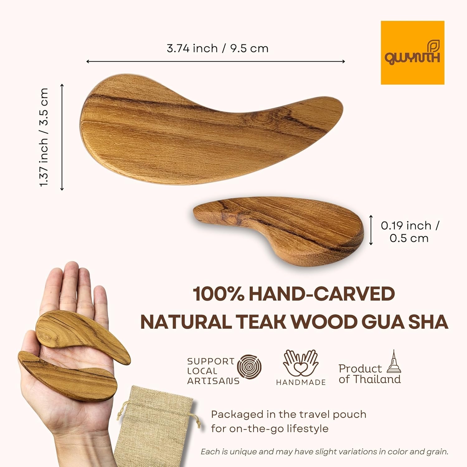 - 🌳DISCOVER THE MAGIC OF TEAK WOOD GUA SHA! Made from 100% premium golden-brown teak wood. This anti-static, lightweight Gua Sha tool is durable and crack-resistant. Each piece is handcrafted by skilled Thai artisans and showcases unique teak grain. Finished with olive oil, it offers healing benefits—reducing stress, restoring your nervous system, and promoting calm.