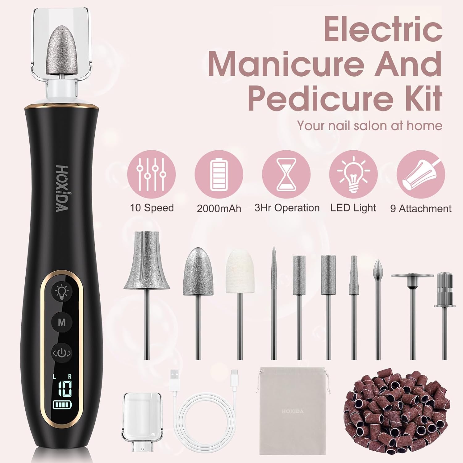 - Sturdy, Low Noise, Low Heat : Hoxida manicure and pedicure tools kit is built to last, with a powerful yet quiet motor with smart heat dissipation, keep the pedicure drill machine is in low noise, low heat while using it. a perfect home pedicure manicure kit for doing your own mani and pedi.with ergonomic body design for comfortable holding, speed and direction controlling. Easy to use, enjoy a salon-quality professional manicure pedicure at home.
