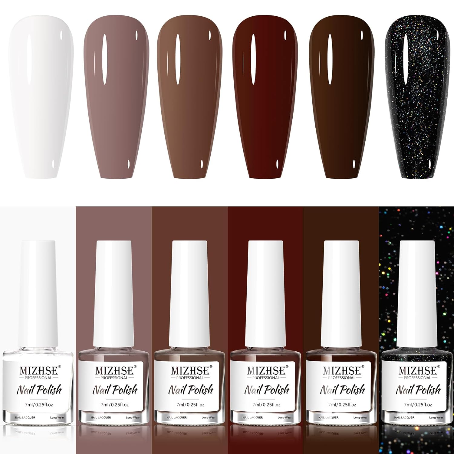 MIZHSE Brown Nail Polish Set - 6 Colors Nude White Glitter Winter Collection Quick Dry DIY Nail Art Salon Gift For Women