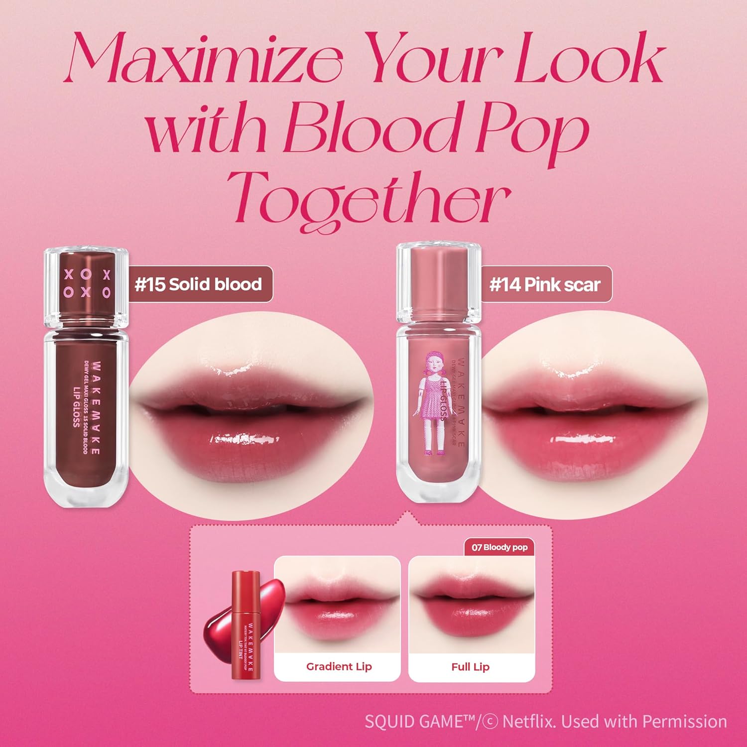 WM X NETFLIX SQUID GAME Dewy Gel Maxi Gloss 15 Solid Blood Set (+Watery Tok Tint Mini 7 Bloody Pop), lips, korean lip