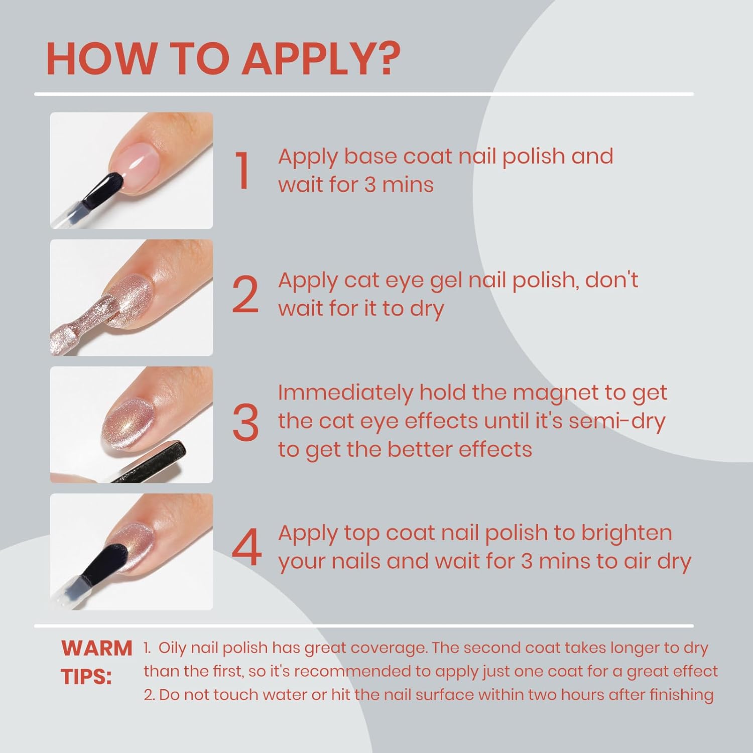 - Important Tips: 1. When the nail polish is not dry yet, it will be fluid. Use magnets to hold it in place until it's semi-dry, then take them off for a sharp cat-eye look 2. Do not touch water or hit the nail surface within two hours after finishing to avoid peeling; 3. Base and top coat nail polish art necessary