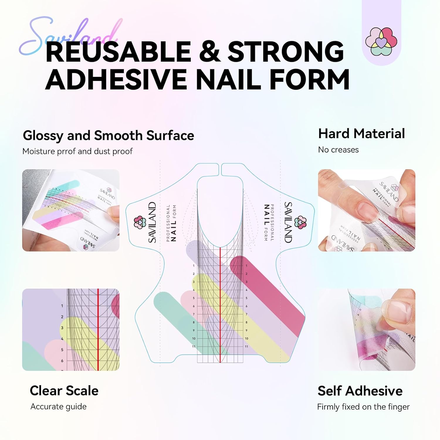 SAVILAND Plus Nail Forms: Reusable Sticky Nail Form for Builder Gel Super Adhesive Nail Extension Forms for Acrylic Nails with Precise Length Guide for Nail Art
