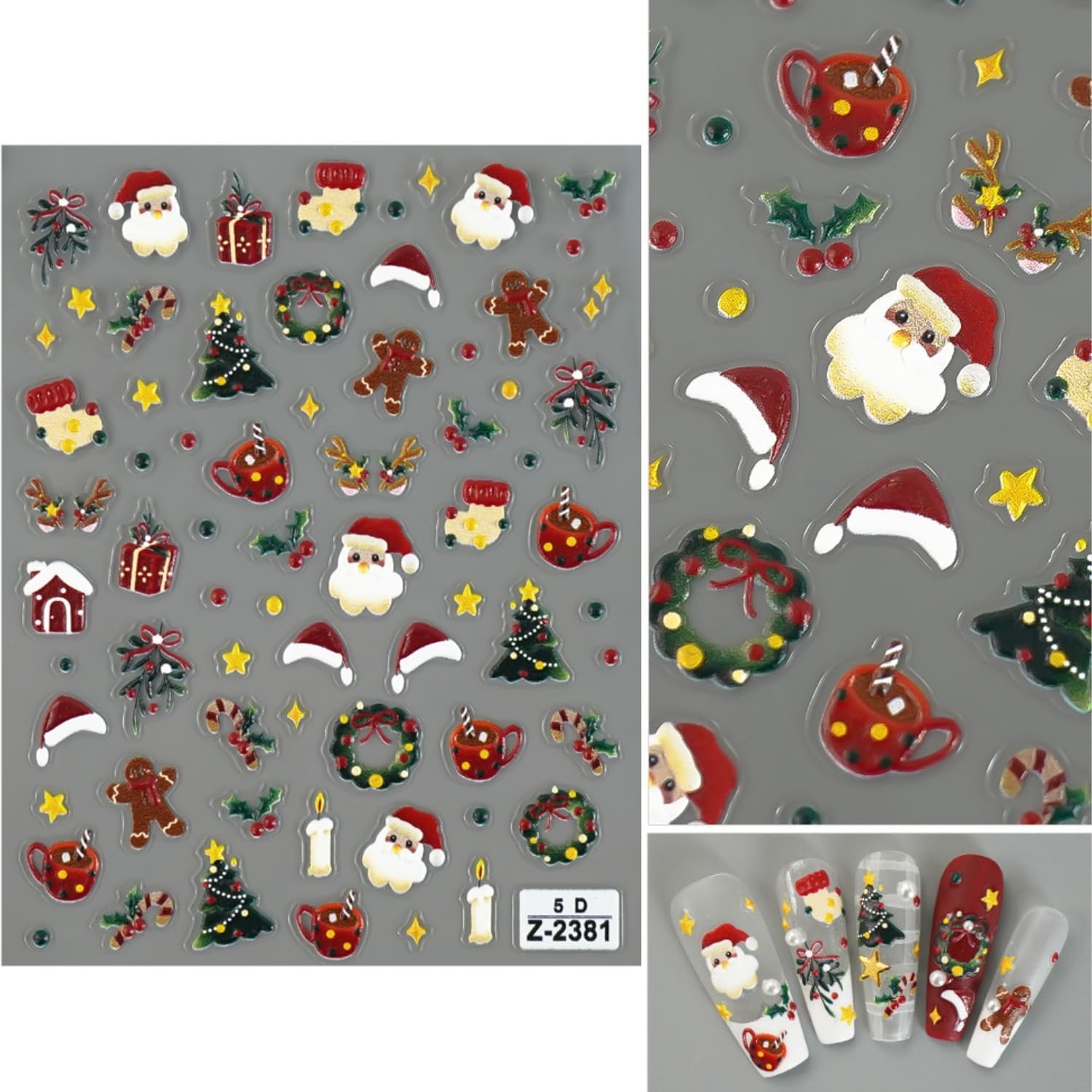 - ăChristmas Nail Designă5D embossed self-adhesive nail decals for nail art with beloved Christmas and New Year elements like Christmas trees and Santa Claus.These designs bring the holiday cheer directly to your nails.