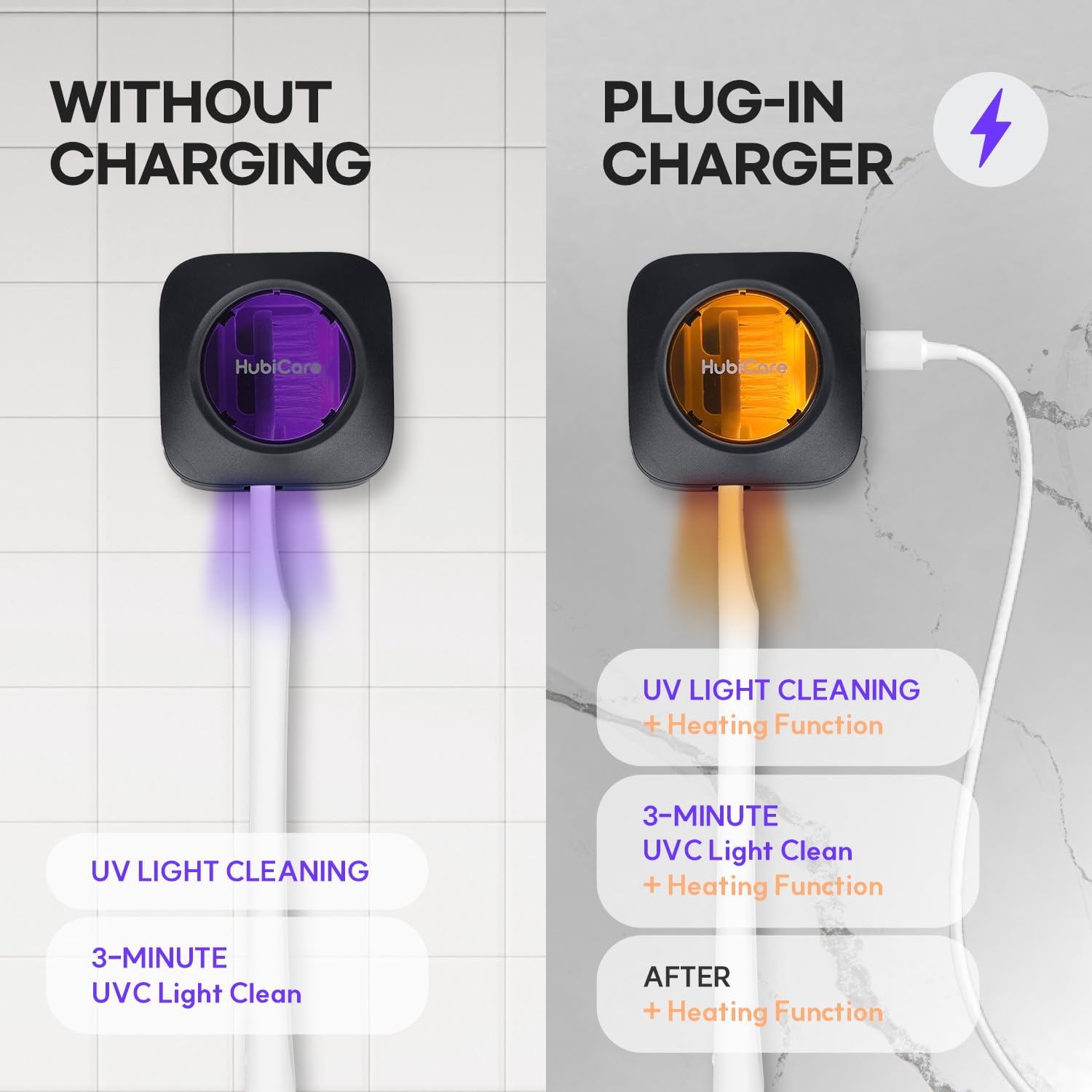 - ✅【New UV-C Light Toothbrush Cleaner】Portable toothbrush holder uses UV light to physically kill up to 99.9% of filth on your toothbrush. Quickly clean all sides of your toothbrush bristles in just 5 minutes. HubiCare toothbrush cleaner case with powerful light can deeply clean your toothbrush, ensuring you and your family have clean toothbrushes.