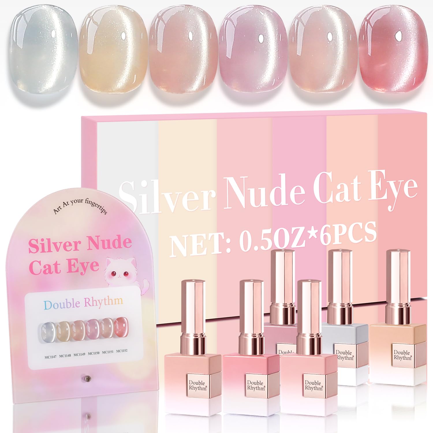Double Rhythm Cat Eye Gel Nail Polish Set of 6 Same Color Same Bottle 0.5 Oz Shimmer Glitter with Magnet Holographic Reflective Magnetic UV Nail Polish Kit at Home (Silver Nude Pink-T6-27)