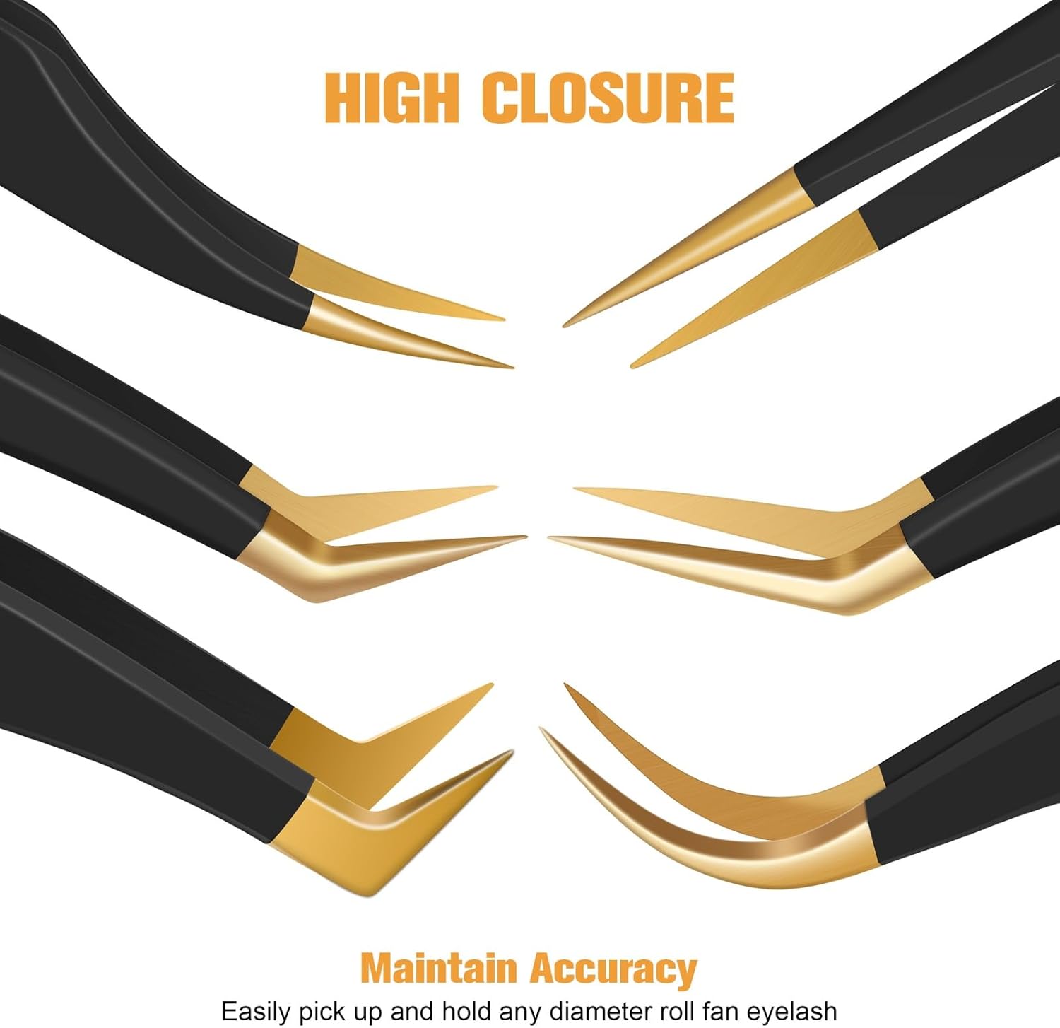 7 Pack Lash Tweezers Set for Eyelash Extensions, High Precision Eyelash Tweezers for Classic & Mega Volume Lashes