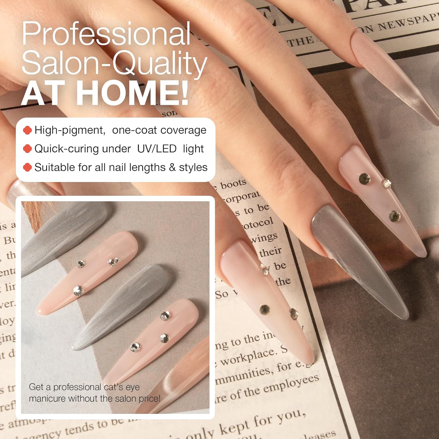 - Easy to Apply: Our gel polish glides on smoothly, providing even coverage and a flawless, glossy finish. Itβs perfect for both beginners and professionals looking to create perfect cat-eye nail art at home.