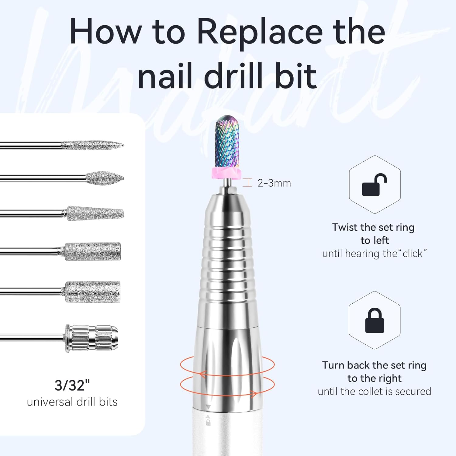 - Easy operation: Makartt Nouvella nail grinder handpiece is designed with nail bit lock knob, please twist to "unlock" release the nail bit and change the desired one, twist the lock knob to "lock" before using. Otherwaise, the overload protection system will be activated and the nail machine will stop to work.