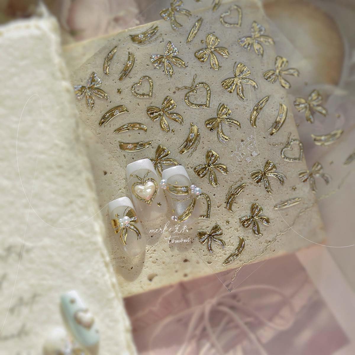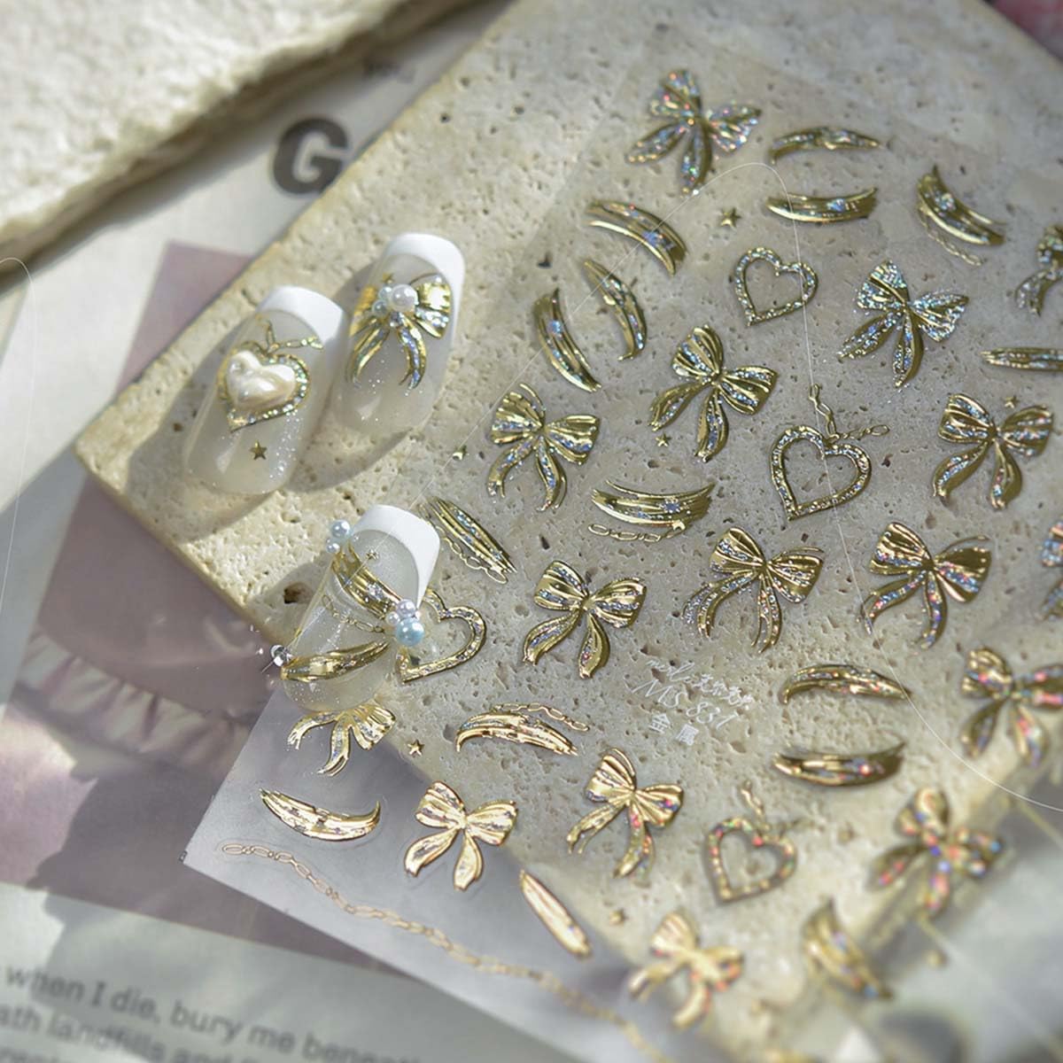 Gold Bow Nail Stickers for Nail Art Heart Bow Nail Decals Coquette Stickers for Nails 3D Self Adhesive Nail Art Supplies & Decorations for Women Girls,1 Sheet DIY Manicure Decor