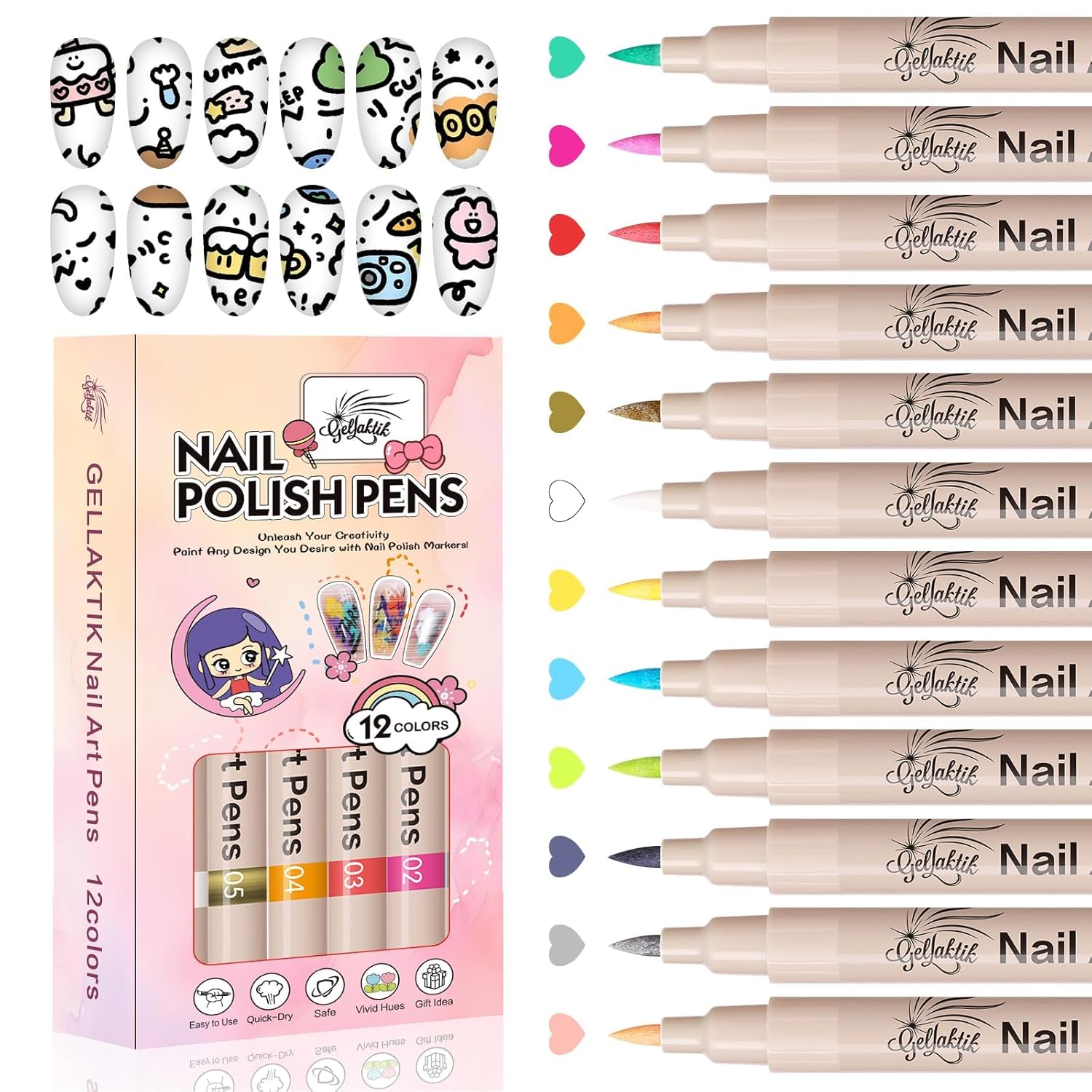 12 Colors Nail Art Pens Set, 3D Nail Color Pens, Quick-Drying Acrylic Paint Markers, Dotting Liner Brush for DIY Nail Design, Home & Salon Manicure Tools