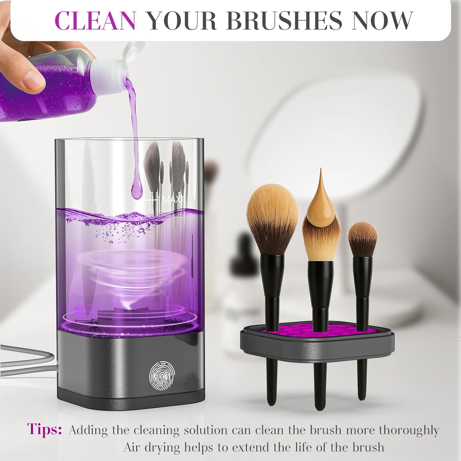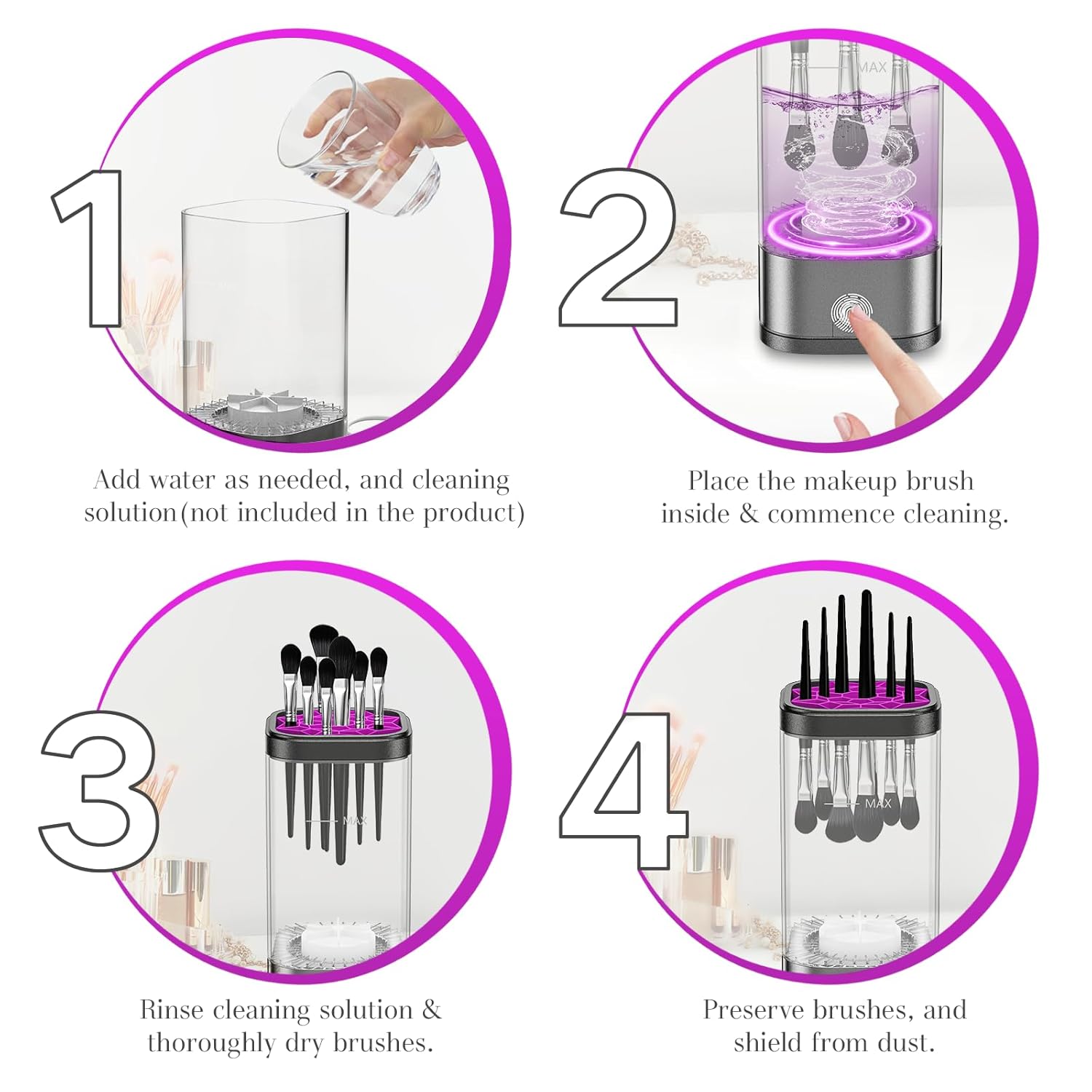 - 🥰𝐖𝐚𝐫𝐦 𝐓𝐢𝐩𝐬: This electric makeup brush cleaner does 𝐧𝐨𝐭 𝐢𝐧𝐜𝐥𝐮𝐝𝐞 𝐛𝐫𝐮𝐬𝐡 𝐜𝐥𝐞𝐚𝐧𝐢𝐧𝐠 𝐬𝐨𝐥𝐮𝐭𝐢𝐨𝐧. For optimal results and to prolong the life of your brushes, 𝐩𝐥𝐞𝐚𝐬𝐞 𝐮𝐬𝐞 𝐚 𝐝𝐞𝐝𝐢𝐜𝐚𝐭𝐞𝐝 𝐦𝐚𝐤𝐞𝐮𝐩 𝐛𝐫𝐮𝐬𝐡 𝐜𝐥𝐞𝐚𝐧𝐞𝐫 𝐥𝐢𝐪𝐮𝐢𝐝