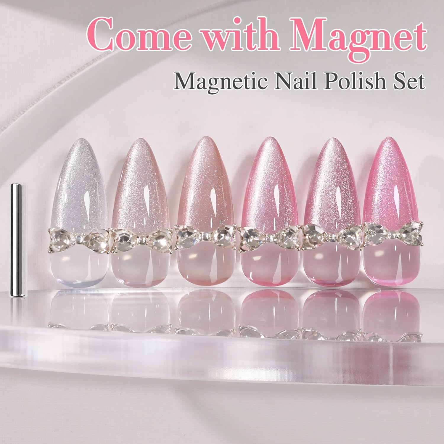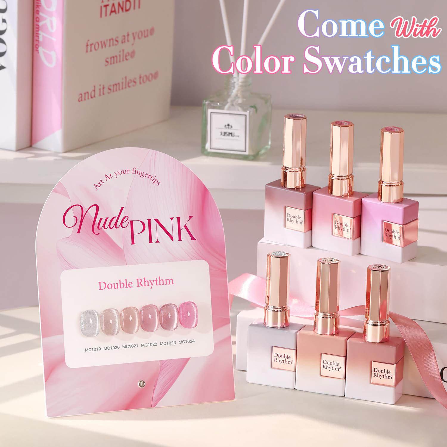 Double Rhythm Cat Eye Gel Nail Polish Set of 6 Same Color Same Bottle 0.5 Oz Shimmer Glitter with Magnet Holographic Reflective Magnetic UV Nail Polish Kit at Home (Silver Nude Pink-T6-42)