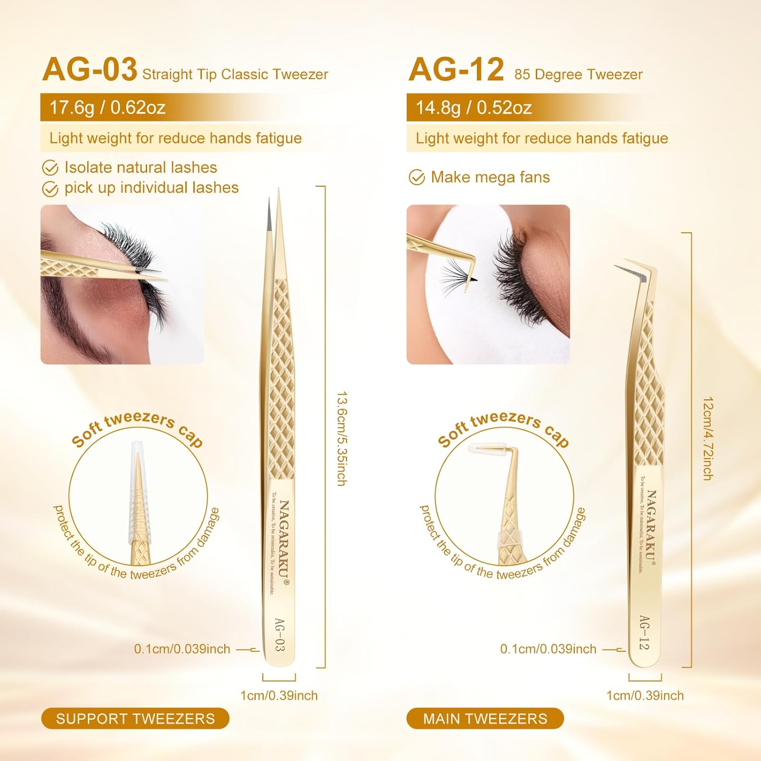 - AG-03+AG-012: Set of 1 Pair of Straight Tip & 85 Degree Long Tip Tweezers. These handcrafted tweezers are made of high-strength stainless steel, which is resistant to most acids and other corrosive agents. We give each tweezer a box to protect the tweezers