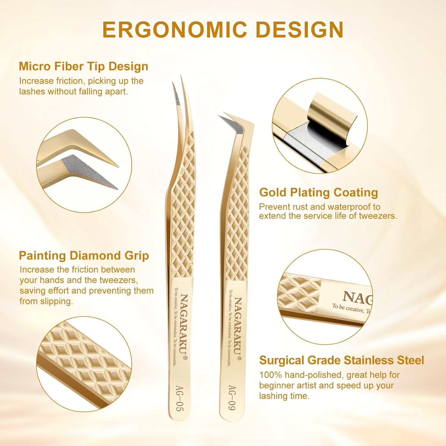 NAGARAKU Eyelash Tweezers, 1 Pair Precision Fiber Tip Tweezer for Lash Extensions Volume Grip Tweezers Antistatic Straight Curved Tip Stainless Steel with Box -Dolphin & L Typ Tweezers AG-05 & AG-09