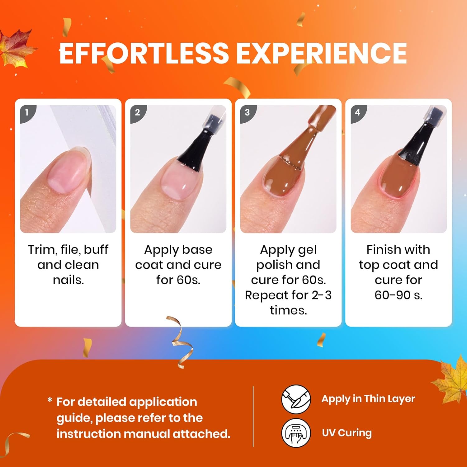 - Easy Application & Smooth Coverage – Highly pigmented formula ensures vibrant, even color with every stroke. Beginner-friendly yet delivers professional-quality results.The nail gel polish Beauty Gift Sets need to be cured under LED Dryer Lamp. Average for LED lamps 60-120 secs.