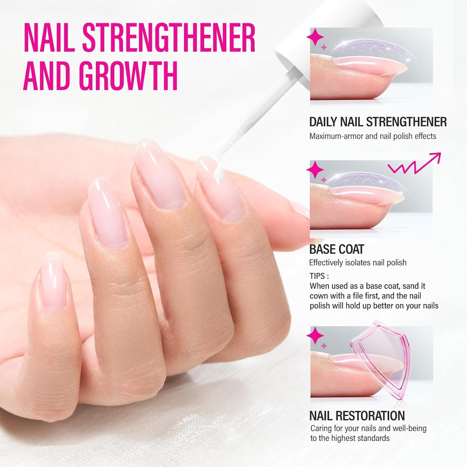 - Meet Our 8 in1 Milky White 15ML Nail Strengthener & Growth – Your Ultimate Nail Care Solution! This advanced formula is designed to tackle thin, weak, damaged, and brittle nails, providing a comprehensive treatment that combines nail strengthening, growth promotion, and base coat protection in one bottle. Say goodbye to splitting, peeling, and soft nails, and hello to strong, long, and healthy nails with just one application.